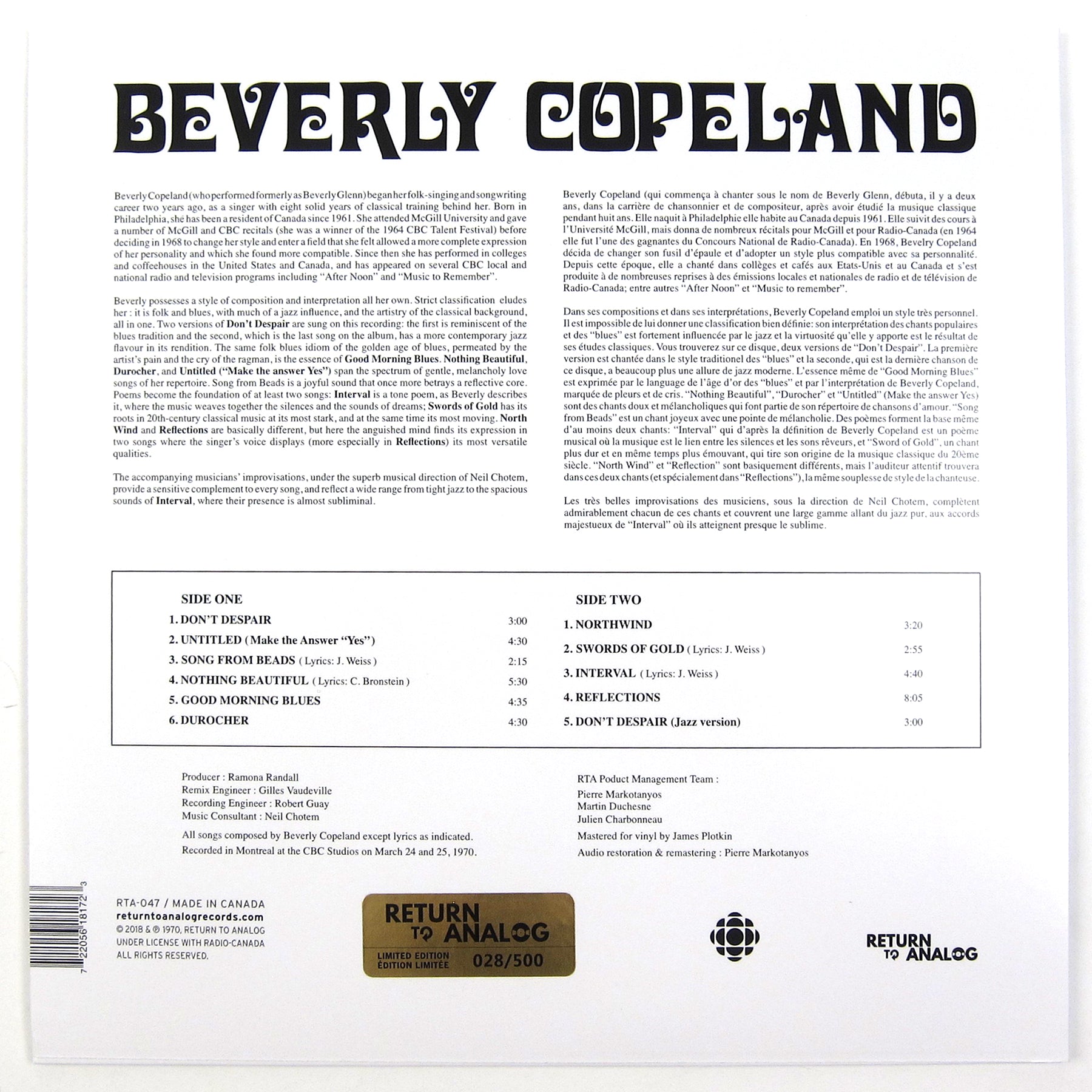 Self-titled debut album from Philadelphia singer songwriter Beverly Glenn-Copeland (known then as Beverly Copeland), not to be confused with his other self-titled album, Beverly Glenn-Copeland, released the same year. After attending McGill University in Montreal, BGC became involved in broadcasting, working for Canadian radio and eventually becoming a writer on Sesame Street, but wrote devastatingly beautiful hybrids of folk, jazz and blues in his spare time. This is highly singular music; rustic, stripped-down, haunting folk ballads exploding with soul whose closest compatriot I can think of is Terry Callier, but even that doesn’t quite hit the mark. Highlights include “Song From Beads,” “Good Morning Blues,” “Make The Answer Yes,” “Reflections” and “Interval.” Recorded at the CBC Radio Canada studios in Montreal, the album was originally run off in an edition of 250 private press copies which now trade hands for anywhere from $300 to a thousand bucks. This individually-numbered edition of 500 looks and sounds fantastic, carefully restored and remastered by French-Canadian amateurs de musique Return To Analog. Includes liner notes in French and English on the back. Recommended.