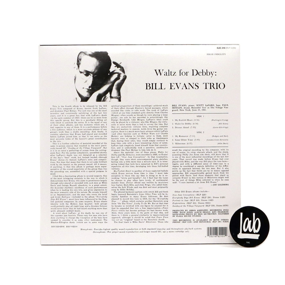 "Waltz for Debby is an album by American jazz pianist Bill Evans and his Trio consisting of Evans, bassist Scott LaFaro, and drummer Paul Motian, originally released in 1961. This was Bill Evans' first trio. The album was the fourth and final effort from the unit - LaFaro died in a car accident just ten days after the live date at the Village Vanguard from which Waltz for Debby and its predecessor, Sunday at the Village Vanguard were taken. The loss of LaFaro hit Evans hard, and he went into a brief seclusion. When Evans returned to the trio format later in 1962, it was with Motian and noted bassist Chuck Israels. The title track, a musical portrait of Evans' niece, became a staple of his live repertoire in later years. It originally appeared as a solo piano piece on Evans' debut album, New Jazz Conceptions. It remains what is likely Evans' most well-known song, one that he would play throughout his career. This album is widely considered to be one of the best in the Evans canon, and the type of emotive interplay between the musicians that at some points seemed almost deconstructed has served as a model for piano trio play." - Original Jazz Classics