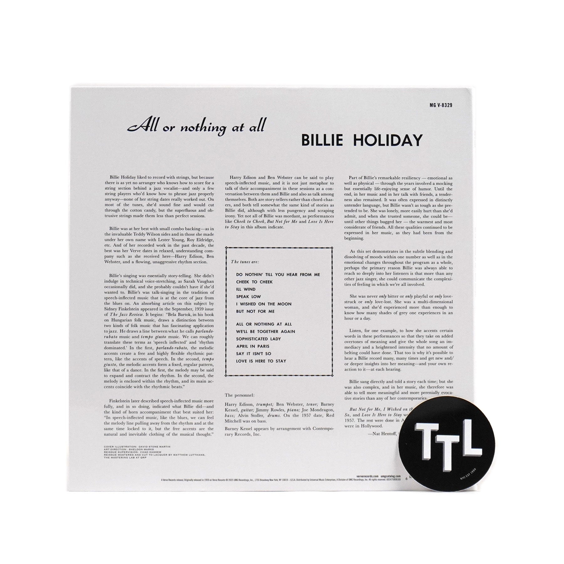 "Recorded in five sessions over 1956/1957 and released in 1958, this 12-track affair is loaded with the classic standards from Berlin, Ellington, Gershwin and more. Though some claimed Billie Holiday was beyond her peak at this point, it was Miles Davis who countered that this was her most effective time with her 'deepest understanding and control' of the repertoire she was performing. Her supporting cast on this album contributes to that as well, which included Barney Kessel (Guitar), Ben Webster (Tenor Sax), 'Sweets' Edison (Trumpet), and Jimmy Rowles (Piano)." - Verve