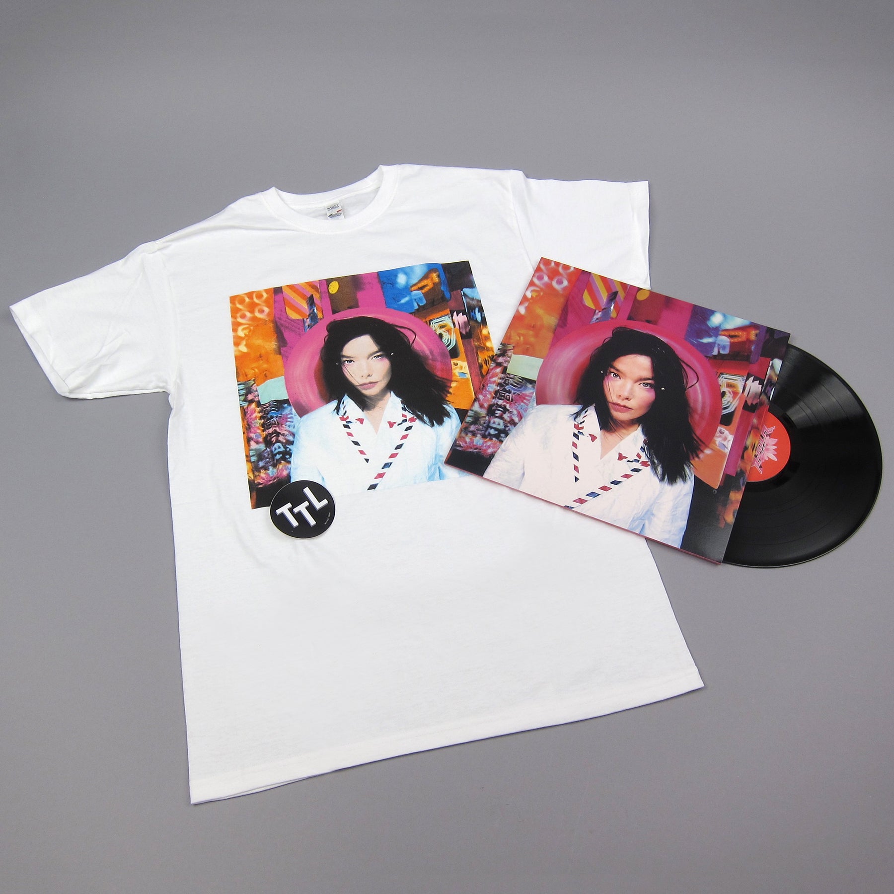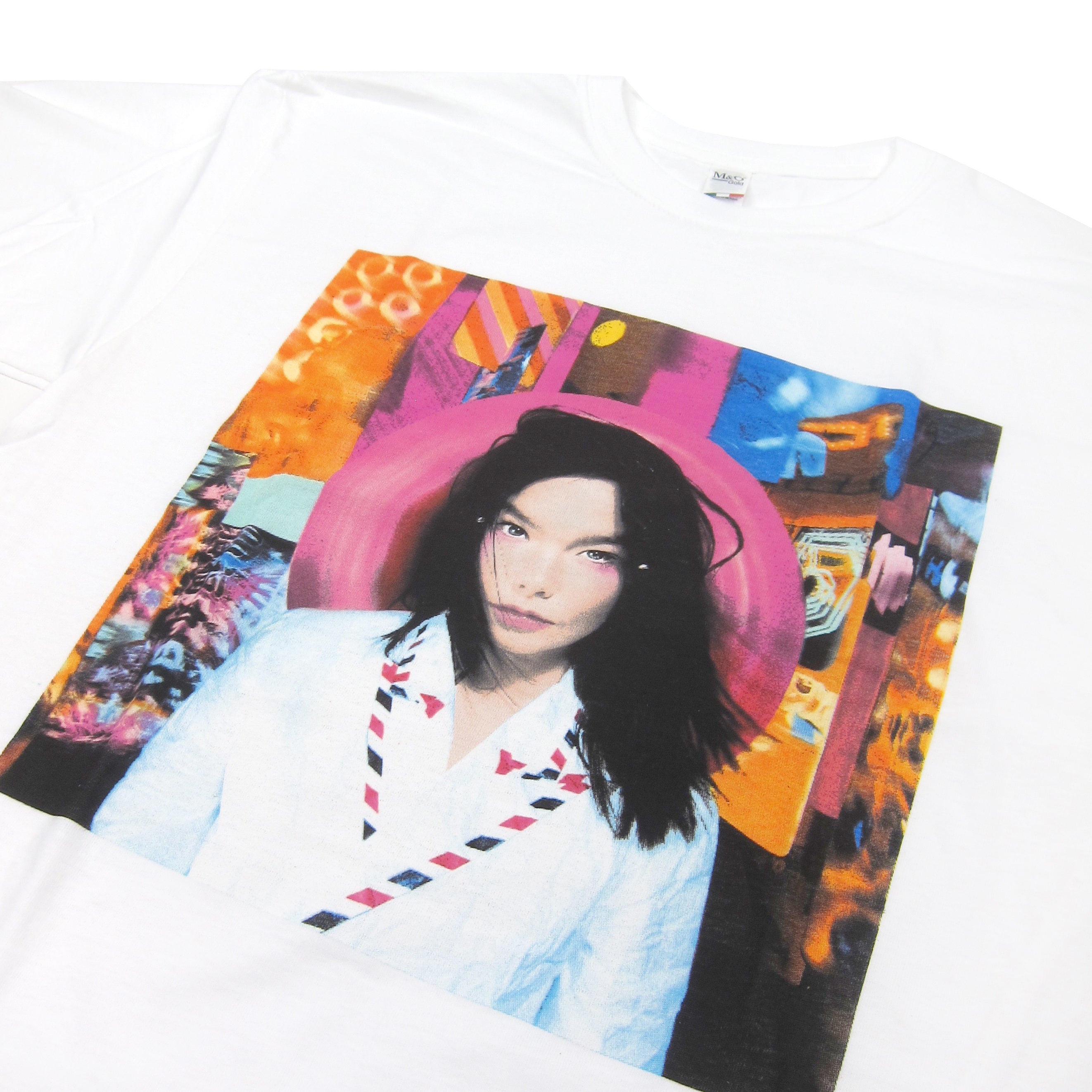 Coverrr Meeee... The iconic cover art for Bjork's second solo album in shirt form. The portrait was snapped by French photographer & director Stéphane Sednaoui, while the background was designed by longtime Bjork collaborator Paul White. What looks like a random assortment of Blade Runner-esque city lights is actually a bunch of giant postcards hanging behind her, and the striped lining in Bjork's top is modeled after the pattern found on British Royal Mail envelopes (Post!). Did everyone in the warehouse buy one of these shirts? Possibly maybe...