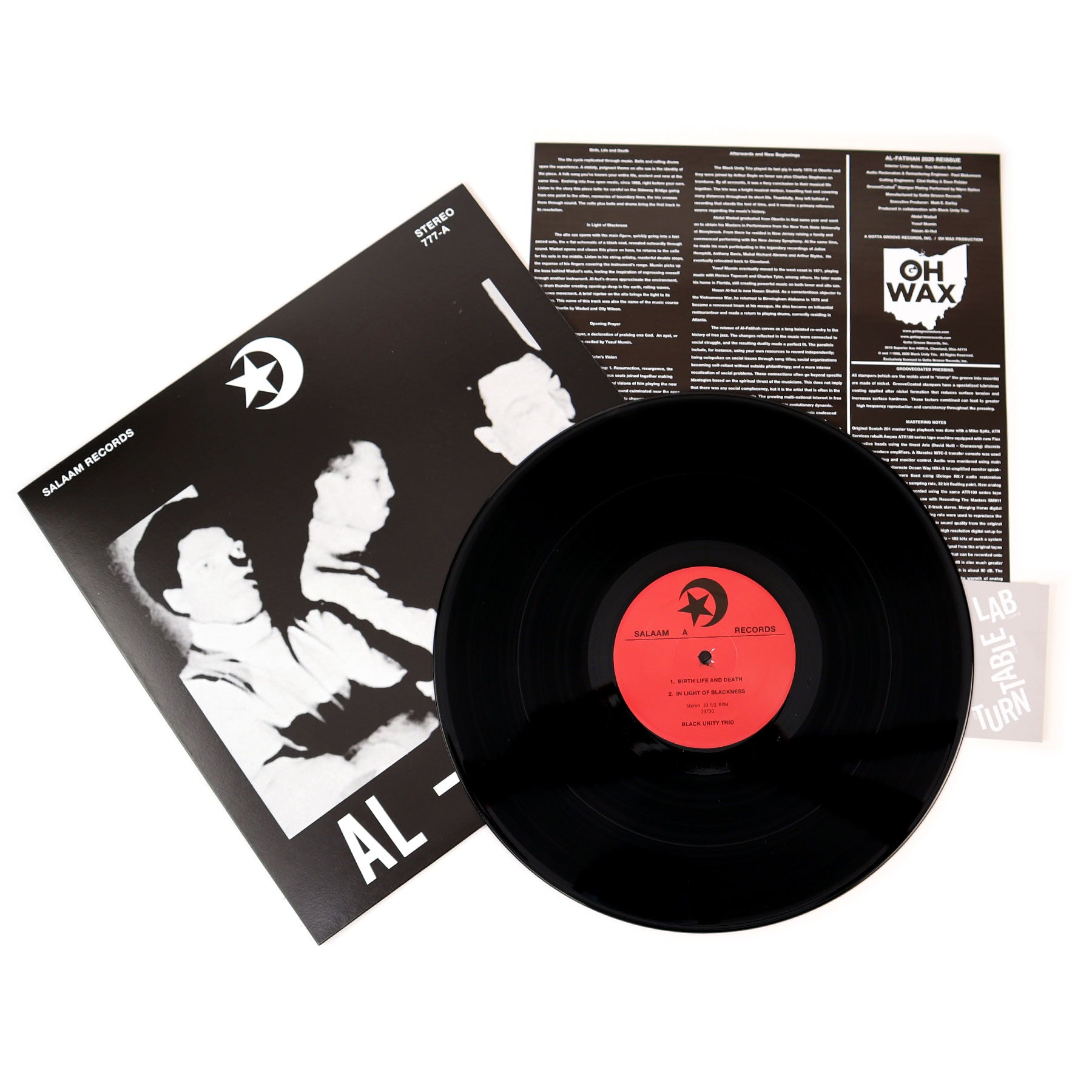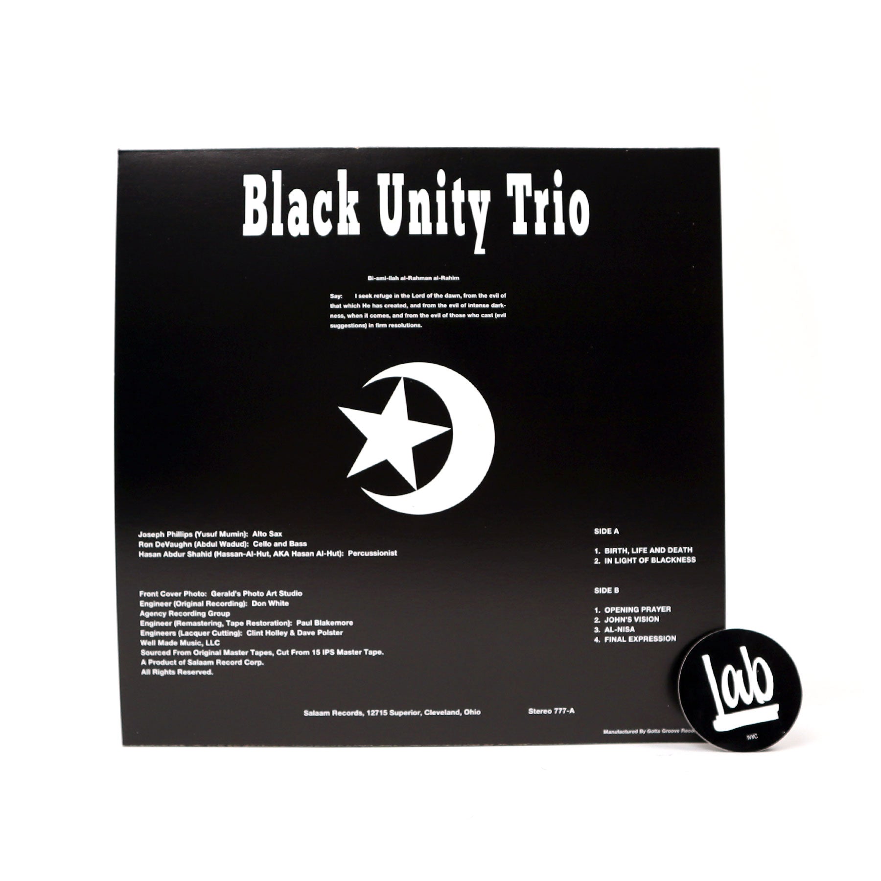 "Black Unity Trio - Al Fatihah quite possibly was the first-ever independently-released free jazz record. Originating in Oberlin, Ohio as the Black Unity Quartet, and ultimately becoming the Trio (Abdul Wadud, Yusuf Mumin, and Hasan Al Hut), the group recorded Al Fatihah in December 24, 1968 at Agency Recording Studio (which was located upstairs in the building housing the legendary Agora Theatre in Cleveland, Ohio). The album ultimately was released in May 1969 in an edition of 500 copies. The album has been legendary among collectors, producers, and DJs in the past several decades, and has been sampled numerous times on other releases. Much mystery surrounded the origins of the album, as well as the status of the musicians, until 2020 when The Wire published an interview with Hasan. Many underground jazz purists know about the intense, though relatively short-lived hotbed of avant-garde jazz in Cleveland, Ohio during the mid-to-late 1960s. Clubs such as Leo's Casino, Jazz Temple, The Doan Club, Le Cave and a few private clubs saw many young avant-garde jazz acts during this time period." - Gotta Groove Records