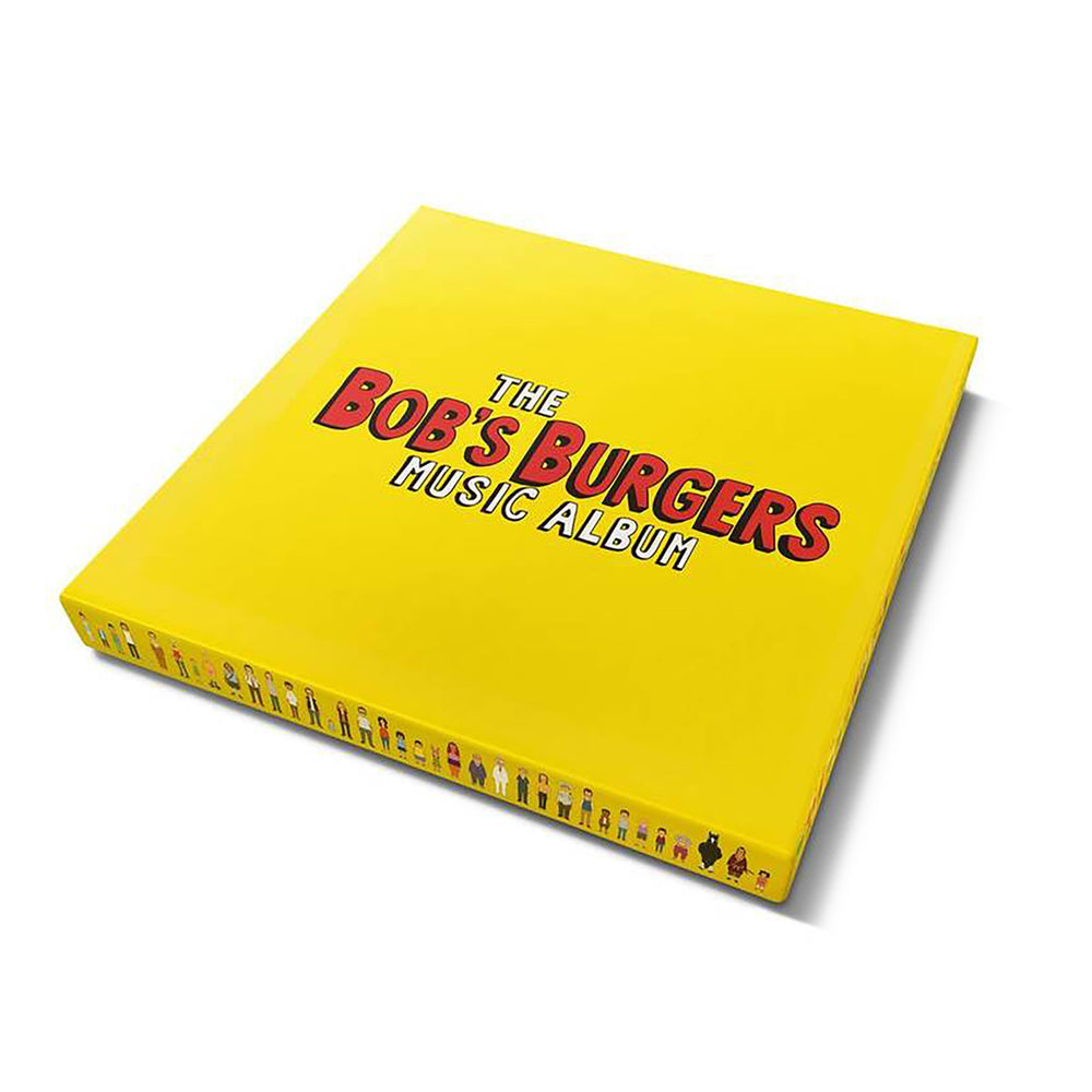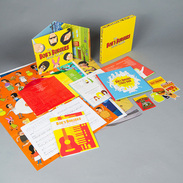 Limited edition deluxe boxset version! For the true Bob's Burgers fan comes this super fancy boxset pressing of the Music Album featuring triple LP colored vinyl (in ketchup red, mustard yellow, and relish green of course) + white 7", plus all the fixings including hardcover illustrated lyric book, softcover sheet music book, 3 folded posters, sticker pack and exclusive patch. The album itself boasts a massive 112 song tracklist featuring 107 songs culled from the first 6 seasons of the show available in full length form for the 1st time ever, plus an additional set of never-aired "Bob's Buskers" cover versions by St. Vincent, The National, Lapsley, and Stephin Merritt of Magnetic Fields. From the label: