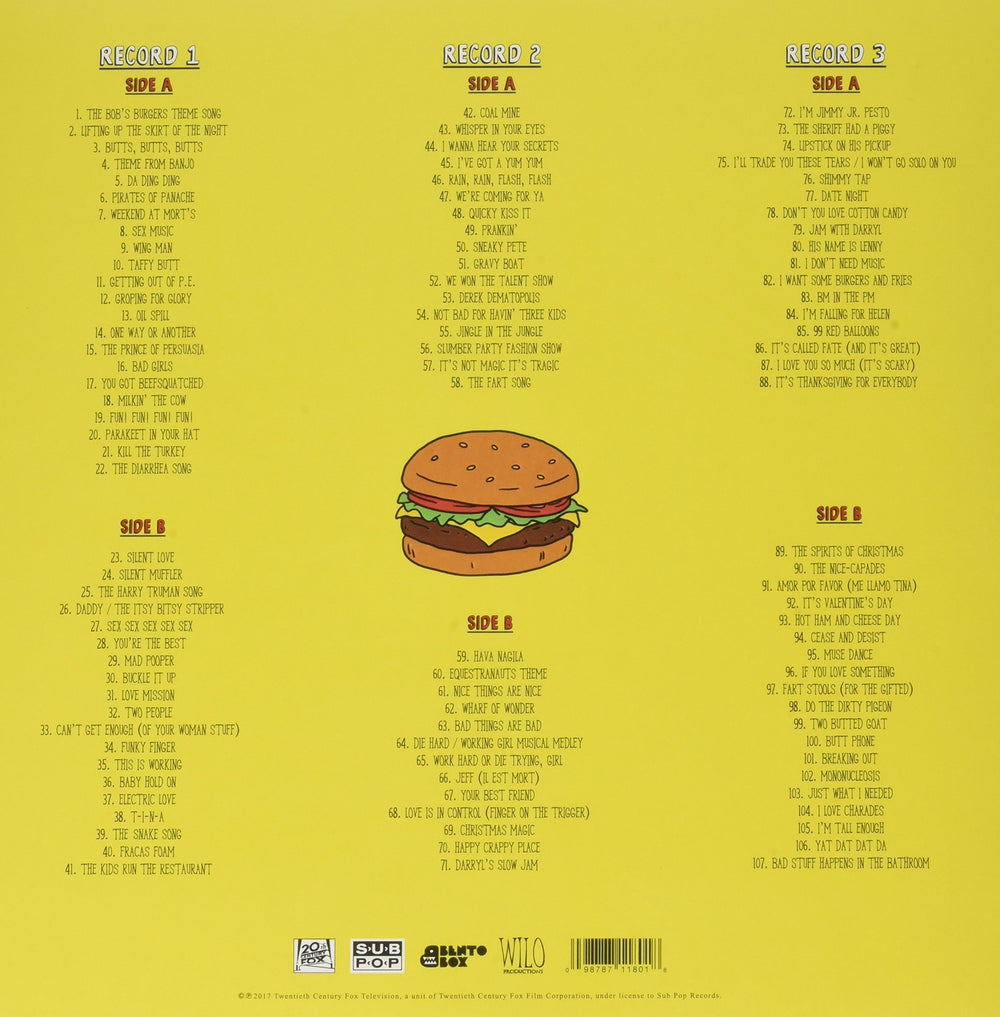 "Bob’s Burgers premiered on the Fox network January 2011, and quickly became one of the most watched series on television. With the seventh season currently in progress and airing through May 2017, Bob’s Burgers’ cultural influence only grows. Now comes The Bob’s Burgers Music Album, featuring 107 songs from the first 107 episodes (all six existing seasons), plus five special cover versions of songs from the show. Originally broadcast within the episodes – and often in abbreviated form – these songs appear here in their freestanding glory for the first time. The Bob’s Burgers Music Album – in both its affordable standard editions and its impressive deluxe edition – is sure to be a must-have for any fan of the show (and, really, any sentient life-form)." - Sub Pop Records