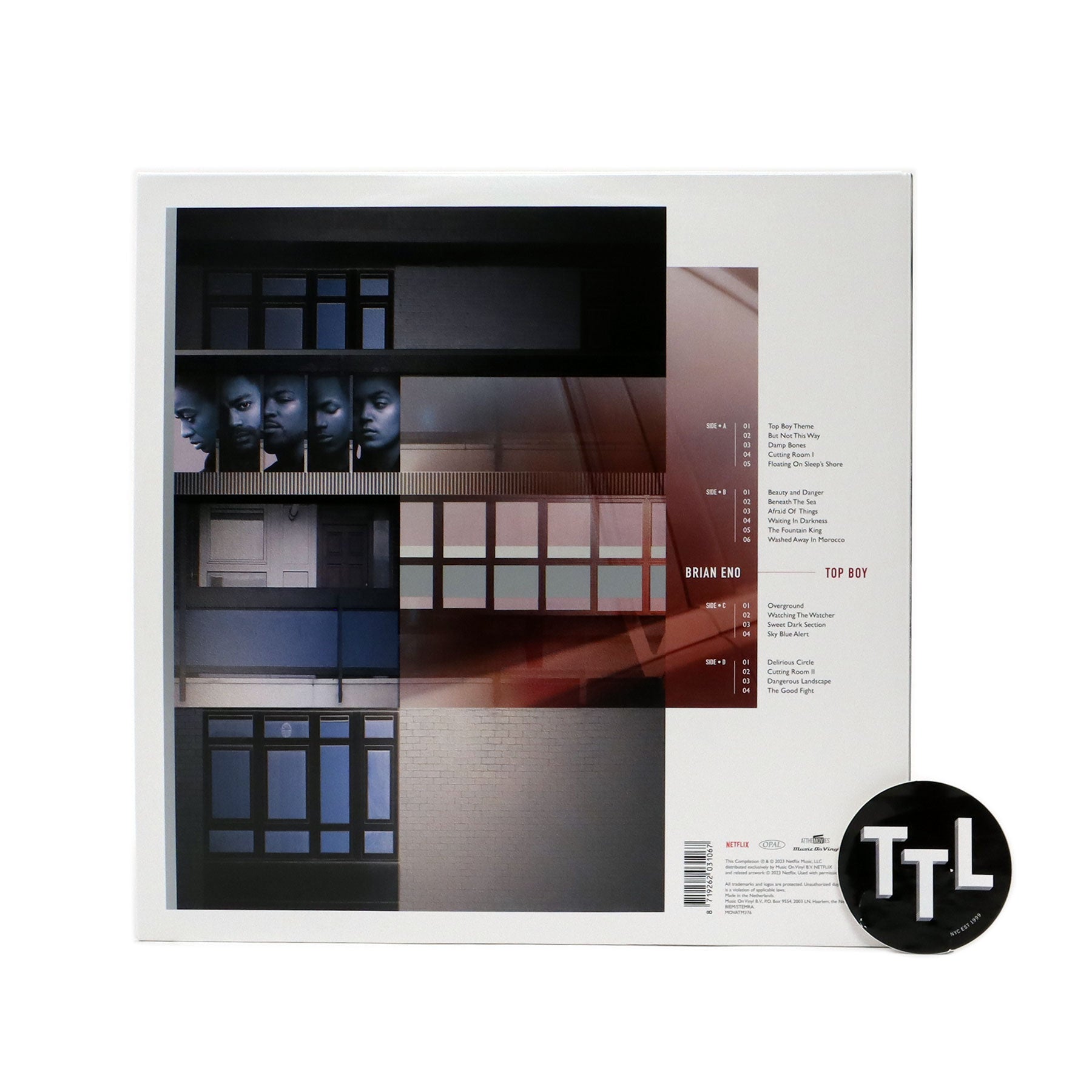“Top Boy is the British television crime drama series, created and written by Ronan Bennett. The story follows two seasoned drug dealers return to the gritty streets of London, but their pursuit of money and power is threatened by a young and ruthless hustler.The first two seasons aired between 2011 and 2013, but following interest from rapper Drake, Netflix announced in 2017 that it would revive the series. Co-produced by the Hotline Bling-rapper, the third and fourth season of Top Boy launched in 2019 and 2022. In the captivating Netflix series Top Boy, Brian Eno's transcendent music serves as a vital companion, molding the narrative's essence with its ethereal power. With a masterful touch, Eno's atmospheric compositions effortlessly transport us into the gritty world of crime, friendship, and survival in East London. From delicate ambience to pulsating beats, his sonic tapestry envelops every scene, elevating the storytelling and evoking a range of emotions. Eno's singular ability to capture the struggle, hope, and inner strength of the characters accentuates the raw authenticity of Top Boy, leaving an indelible mark on its viewers. His haunting melodies and intricately crafted soundscapes symbolize the unyielding resilience amidst chaos, making Brian Eno's music an integral and unforgettable component of this groundbreaking series. The 2LP Top Boy is available as a limited edition of 4000 copies on crystal clear vinyl, including printed innersleeves.” - Music On Vinyl