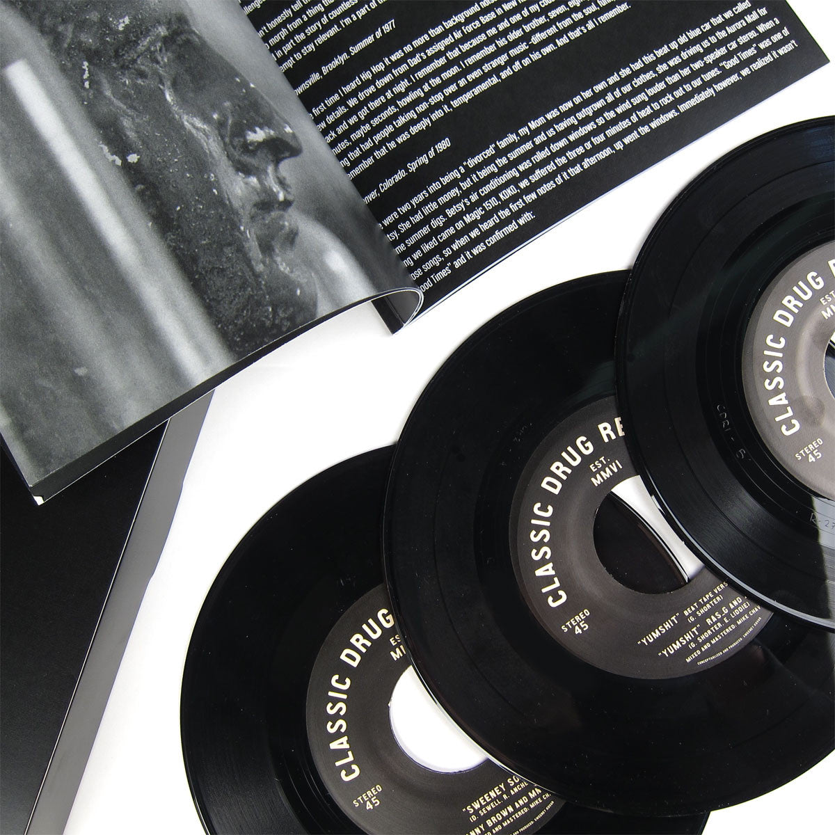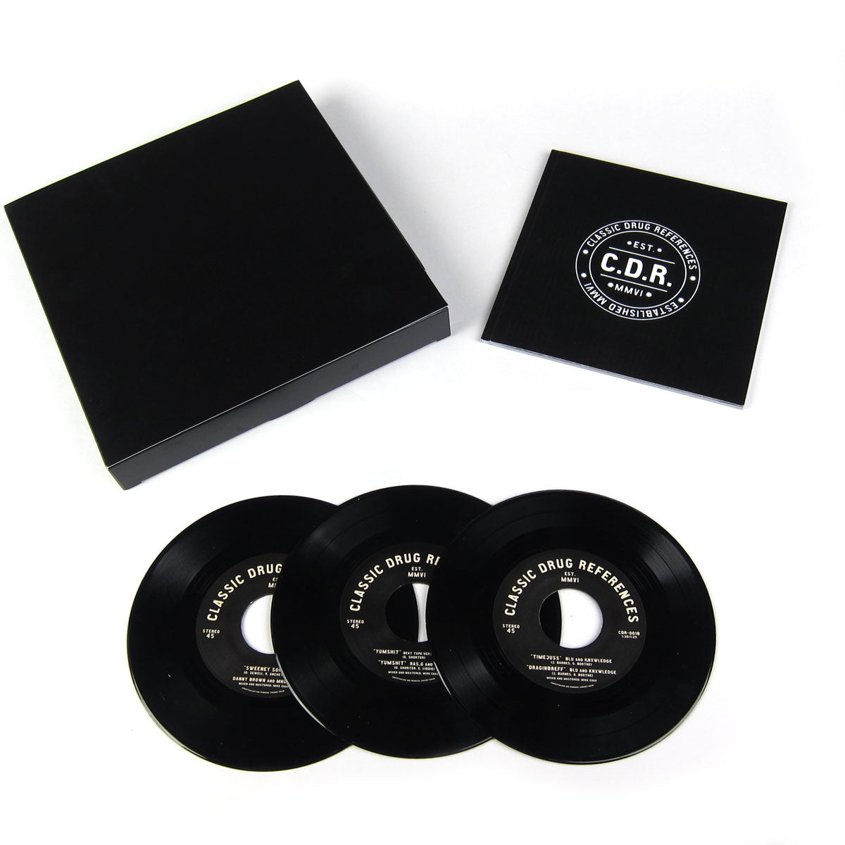 Sweeney Kovar has turned his now defunct rap blog Classic Drug References into a label and compilation series of the same name. He seems to have made some good connections in the years since he shut down the blog. The first installment in the label's series features track from west coast heavy hitters like Blu and Ras G as well as Detroit's notorious Danny Brown. Things kick off with a mellow guitar loop from Mike Chav, engineer and producer for Erykah Badu and Jay Electronica. It's an easy point of entry for a collection of tracks that maintain some serious abstract vibes while occasionally diving into left coast hip hop. Blu & Knxwledge keep things close to the latter while Ras G takes things into his typically outer space direction. Somehow Zeroh finds his way around the track and delivers some equally out there rhymes. I've got to say I'm not familiar with Pablo Ygál, but his "Disappear Without A Trace" is a welcome inclusion. It has a jazz fusion feel with a little Topanga Canyon vibe mixed in. The comp closes with two producer and MC pairings that you probably wont see anywhere else. The Danny Brown cut features Mndsgn production that is about as open as anything Brown has spit over to date. It would be a hard act to follow, but Dibiase cleans things up with a Dilla inspired beat for Quelle. It's a closing track that brings us back to reality. Triple 7" boxset including detailed liner notes, interviews and photographs.