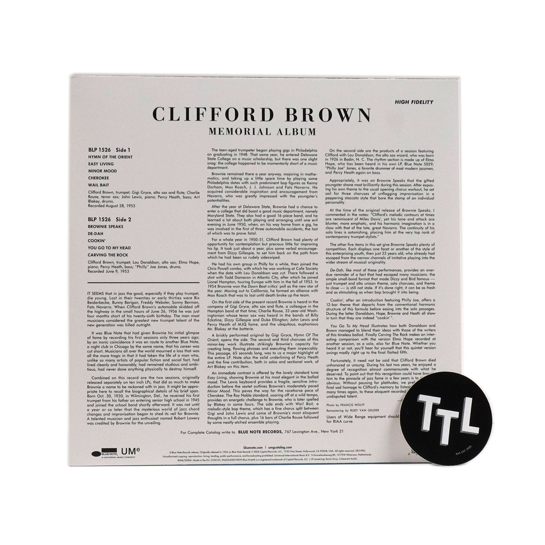 "The incomparable trumpeter Clifford Brown’s star was just starting to ascend when he recorded two sessions as a leader for Blue Note in 1953 — a co-led quintet date with alto saxophonist Lou Donaldson and a sextet date under his own name — that were later compiled on the 12" LP Memorial Album (BLP 1526) shortly after his tragic death in a car accident in 1956. Side 1 presents the sextet with alto saxophonist Gigi Gryce, tenor saxophonist Charlie Rouse, pianist John Lewis, bassist Percy Heath, and drummer Art Blakey on a blistering version of 'Cherokee,' the stunning ballad performance of 'Easy Living,' the Quincy Jones bebop theme 'Wail Bait,' and more. Side 2 finds the Donaldson-Brown Quintet with Heath on bass, Elmo Hope on piano, and Philly Joe Jones on drums cooking through a set including Brown’s briskly paced original 'Brownie Speaks,' Hope’s grooving 'De-Dah,' and the resplendent ballad 'You Go To My Head.' This Blue Note Classic Vinyl Edition is mono, all-analog, mastered by Kevin Gray from the original master tapes, and pressed on 180g vinyl at Optimal." - Blue Note Records