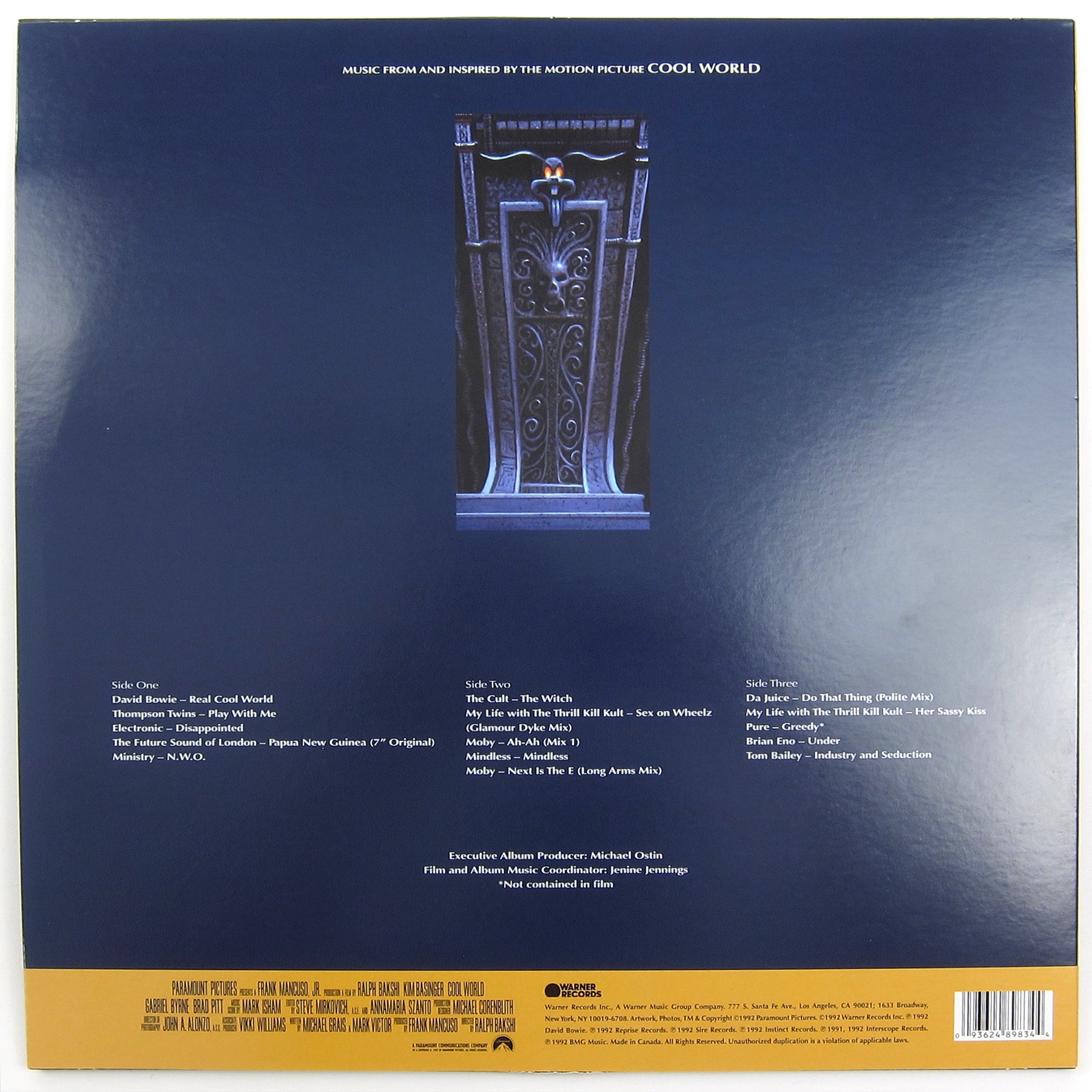 Cool World is a 1992 live action / animated hybrid film directed by Ralph Bakshi and starring Kim Basinger, Gabriel Byrne, Brad Pitt. The film was originally pitched as an animated horror film about an underground cartoonist who fathers an illegitimate half-human half-cartoon daughter, but the script was rewritten into a more straightforward romantic romance when the studio demanded the film be rated PG. The film was not a financial success, but became a cult classic, earning praise for the painterly aesthetic of the live action footage and thoughtful interpretation of the classic Fieischer Studios animated aesthetic. The soundtrack is a nice snapshot of popular alternative music at the time, an early instance of “electronica” making its way up the US charts. “Real Cool World” was the first new Bowie song after Tin Machine, and features production by Nile Rogers, their first reunion since 1983’s Let’s Dance. Other highlights include “Disappointed” by the supergroup of Bernard Sumner (New Order), Johnny Marr (The Smiths) and Neil Tennant (Pet Shop Boys), “Ah-Ah” by Moby, and “Under” by Brian Eno. Pressed on “flesh” colored vinyl, the D-Side features an etching of characters from the film.