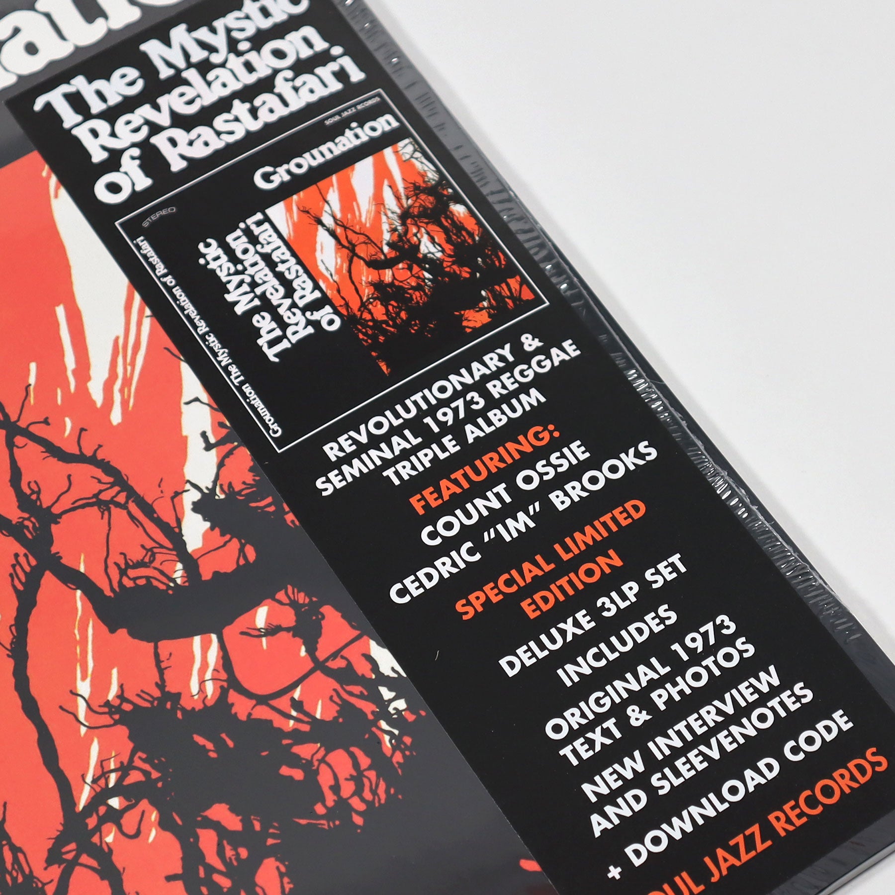 "Like Sun Ra's Arkestra and John Coltrane are to jazz, the Mystic Revelation of Rastafari are to reggae – the ultimate expression of roots music and Rastafarian ideology in reggae music, music functioning at a high level of spiritual consciousness combined with an equally avant-garde and forward-looking approach to sound. The group's stunning, unique and groundbreaking 1973 album ‘Grounation’, a mighty conceptual triple-album (the first ever reggae triple!) is, similar to Marvin Gaye's What's Goin' On, a definitive all-encompassing cultural statement of its time and place. A sprawling album of raw and unique cultural expression that combined Rastafari consciousness with deep spiritual jazz music – an absolute and essential classic of Reggae music. The Mystic Revelation of Rastafari group came into existence at the start of 1970s, the union of two former Studio One artists (and groups) of equal repute – Count Ossie & his African Drums and saxophonist Cedric ‘Im’ Brooks’ & his group, The Mystics. Master drummer Count Ossie and his collective of Rastafarian drummers performed for Haile Selassie on his momentous visit to Jamaica in 1966. Cedric Brooks came out of the Alpha Boys School – the fertile breeding ground of musicians who dominated the Jamaican music scene from the 1960s onwards. The Mystic Revelation Of Rastafari’s ’Grounation’ is a massive opus, a work of profound musical genius that tells the story of Jamaica through music and words. A cornerstone in the history of reggae, a unique and other-worldly album the like of which has never been made since. Soul Jazz Records are releasing this long-revered album in a deluxe 3LP edition complete with extensive new sleevenotes, photography, exact reproductions of the original text and artwork, and a new interview with founding member Sam Williams (aka Time)." - Soul Jazz Records