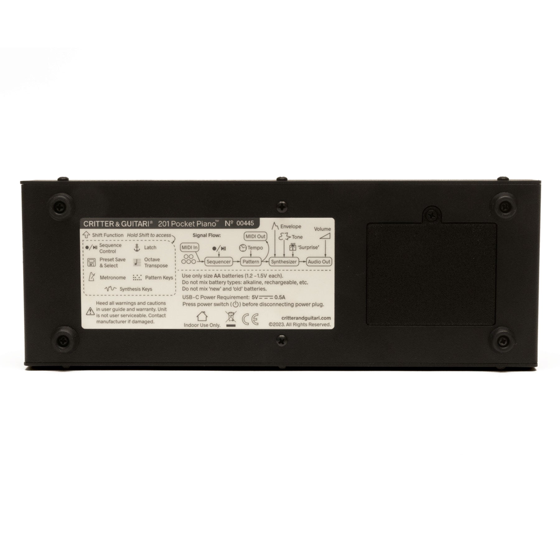 "At the heart of the 201 are six sound engines providing a wide range of sonic texture. Use the shift key to select an engine. There is a little bit of everything: chiptune style waveforms, analog style filters, drum samples, realistic physical instrument models, and even a human vocal synthesizer. Use the three center control knobs to further explore the sounds. Dial in the right amount of sustain, or adjust the tone. Or turn the 'surprise' knob if you are brave!" - Critter & Guitari