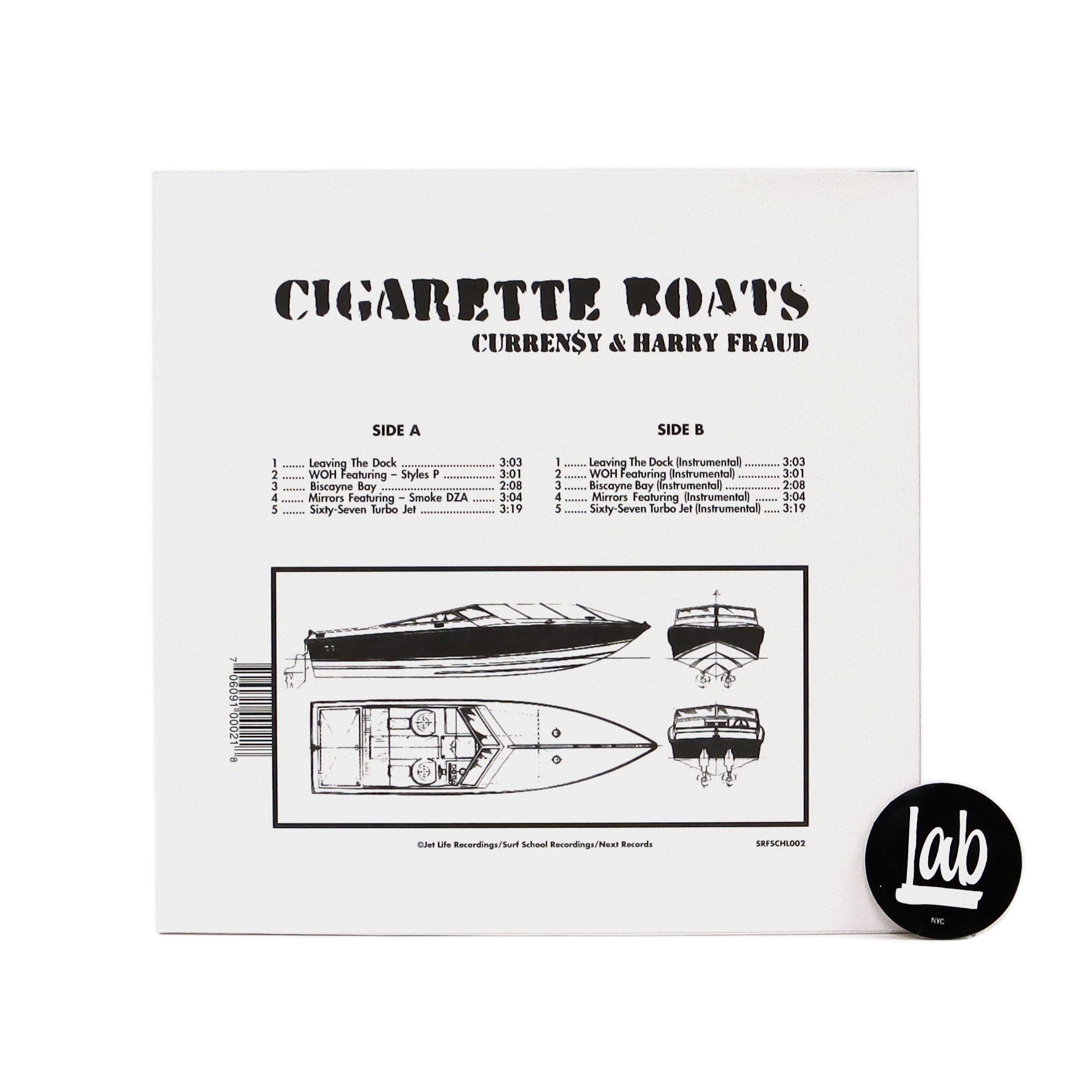"Originally released on July 9th, 2012 via Soundcloud, Cigarette Boats is NOW available on wax! When Curren$y (aka Spitta Andretti) & Harry Fraud collab, they create classics, something which is most definitely evidenced on Cigarette Boats. The merger of Harry’s signature production and Spitta’s deadly flow show why XXL Magazine named it the 2012 EP of the Year. The duo decided it was time to make Cigarette Boats available in all formats, along with the instrumentals exclusively on vinyl. Fraud recalled his audition for Curren$y, after meeting him while working on a Smoke DZA project: 'I had met Curren$y briefly for one second at a radio station, but that was the first time we really kicked it. He just asked me to play some beats, and I played like five beats, and he was just like, 'Yo, I need all of those. We gotta do a little EP with those.' Those same five beats became the entire sound bed for the Cigarette Boats." - Jet Life Recordings