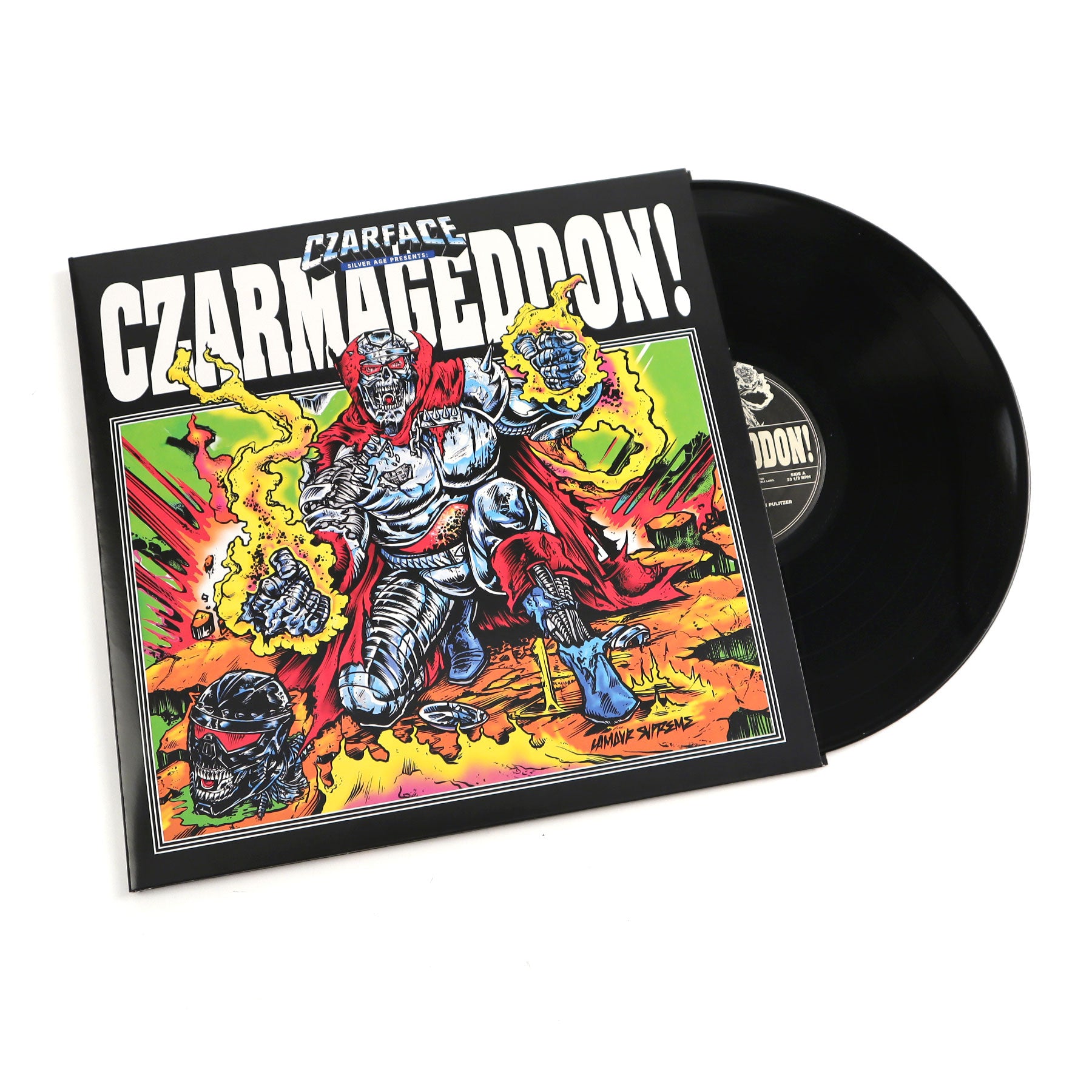 "Hot off their two smashes for Marvel’s blockbuster film Venom: Let There Be Carnage, CZARFACE is back, triumphantly swinging into your universe with their new LP CZARMAGEDDON! Expect many twists and turns as Wu-Tang Clan's Inspectah Deck and Esoteric go to war with an all-new, all-different soundscape from Czarface producers the Czar Keys. Alt-rap icon Kool Keith shatters the lyrical glass and the enigmatic Frankie Pulitzer, who first appeared on the Venom soundtrack on Czarface’s 'Today’s Special', is back with guns blazing. Collectors will crash the gates for this all new chapter of the Czarface saga. Includes exclusive trading cards illustrated by Czarface chief artist Lamour Supreme!" - Silver Age