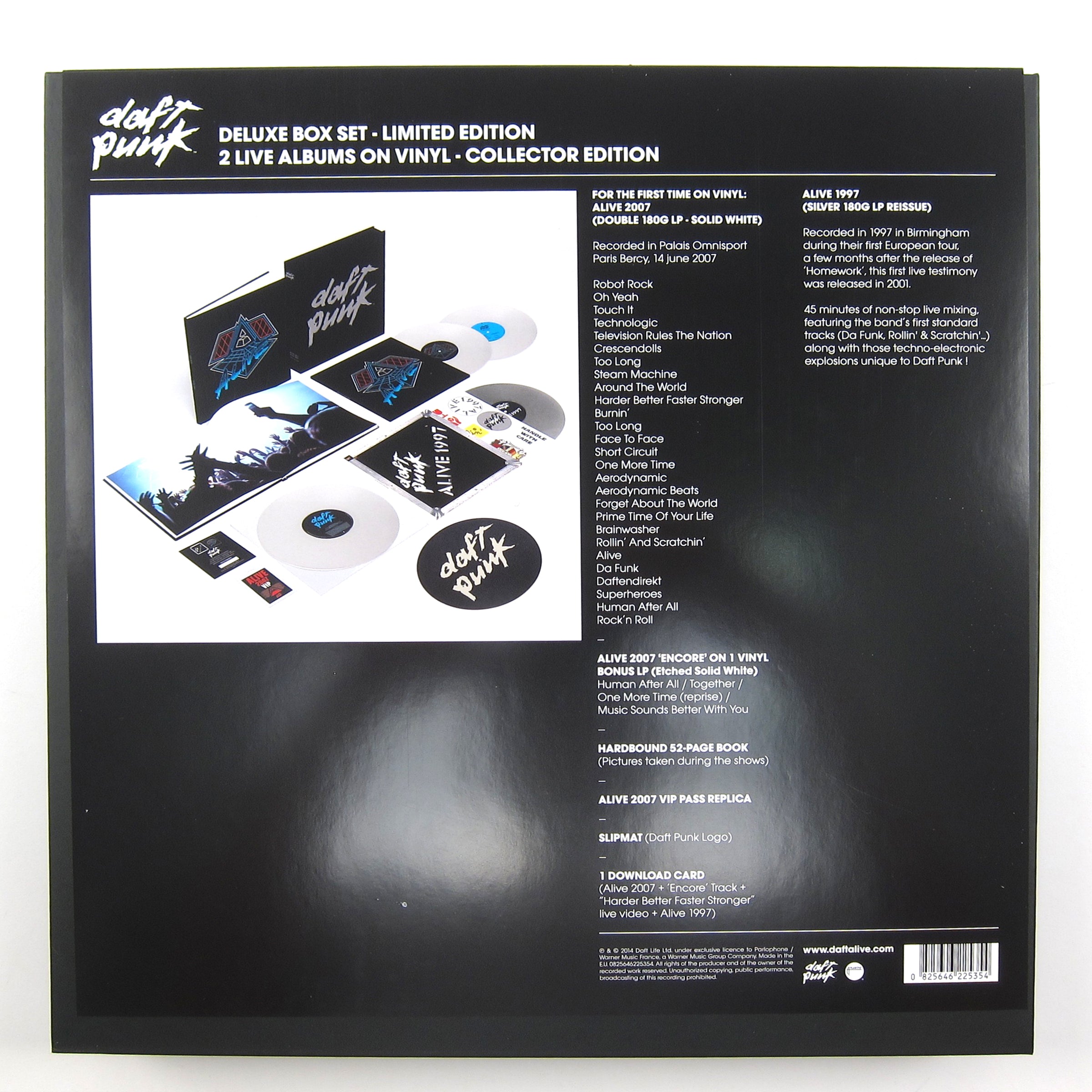 Super deluxe pressing of both of Daft Punk's live albums! This boxset contains both Alive 1997 and Alive 2007 along with a bunch of other collectible goodies. If you've been a fan of the French robots you're going to want to get your hands on this! Colored vinyl pressings of both of the albums, each housed in their respective sleeves. A 52 page hardcover book with fan photos from the Alive 2007 tour. You also get a slipmat and a VIP pass from the 2007 tour. They even threw in downloads of both of the albums. It doesn't get much better than this! Recommended.