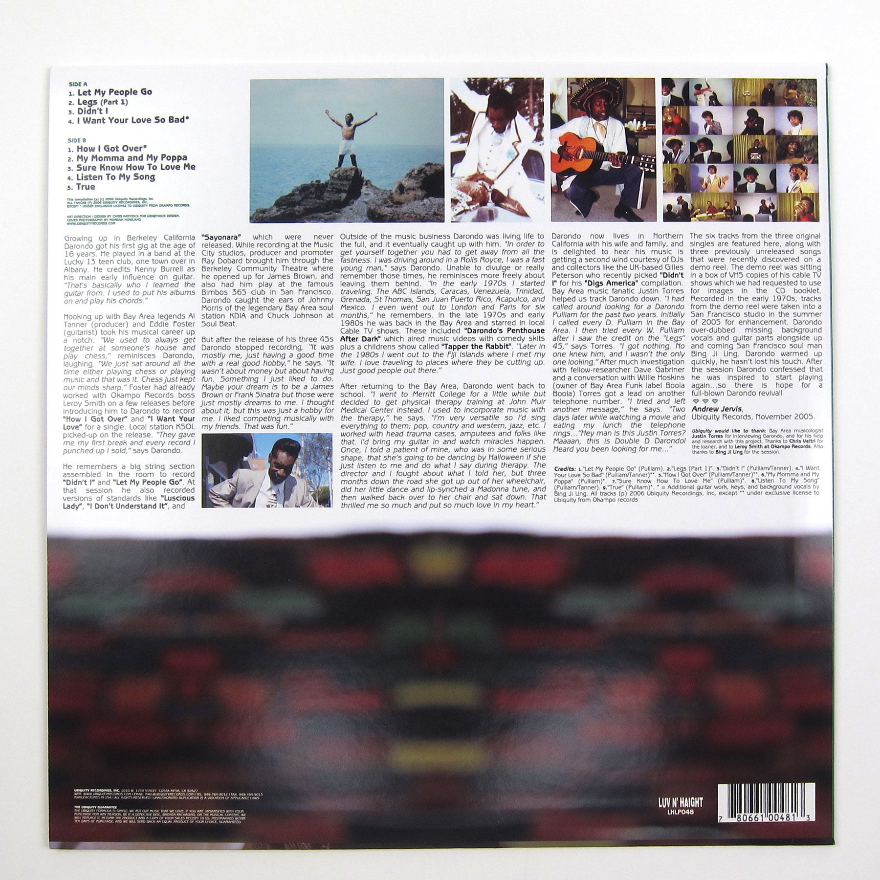 • Where to begin with the funky enigma that is Darondo? You probably clicked the "more info" button for one of two reasons: either you know Darondo's "Didn't I" as the lead-off slow-burner from Gilles Peterson's Digs America comp, or you saw the dude on the cover -- the one who looks like a pensive, iced-out Screamin' Jay Hawkins -- and just had to know who it was. No matter what the reason, you've just lucked out, for Darondo has got to be one of the most unexpected and pleasant musical surprises in recent memory. An underground legend in the Bay Area, Darondo was recently tracked down by Ubiquity Records. Not only did he give them permission to reissue some of his classic 1960's recordings, but he also went into the studio and recorded additional vocals for some of his unfinished works. Darondo's got range, too: you get a little bit of everything from his broad pallette, from hard funk to smooth soul joints. 9 cuts in all, in a pic sleeve which features the man himself on the front and details the entire saga of Darondo on the back.