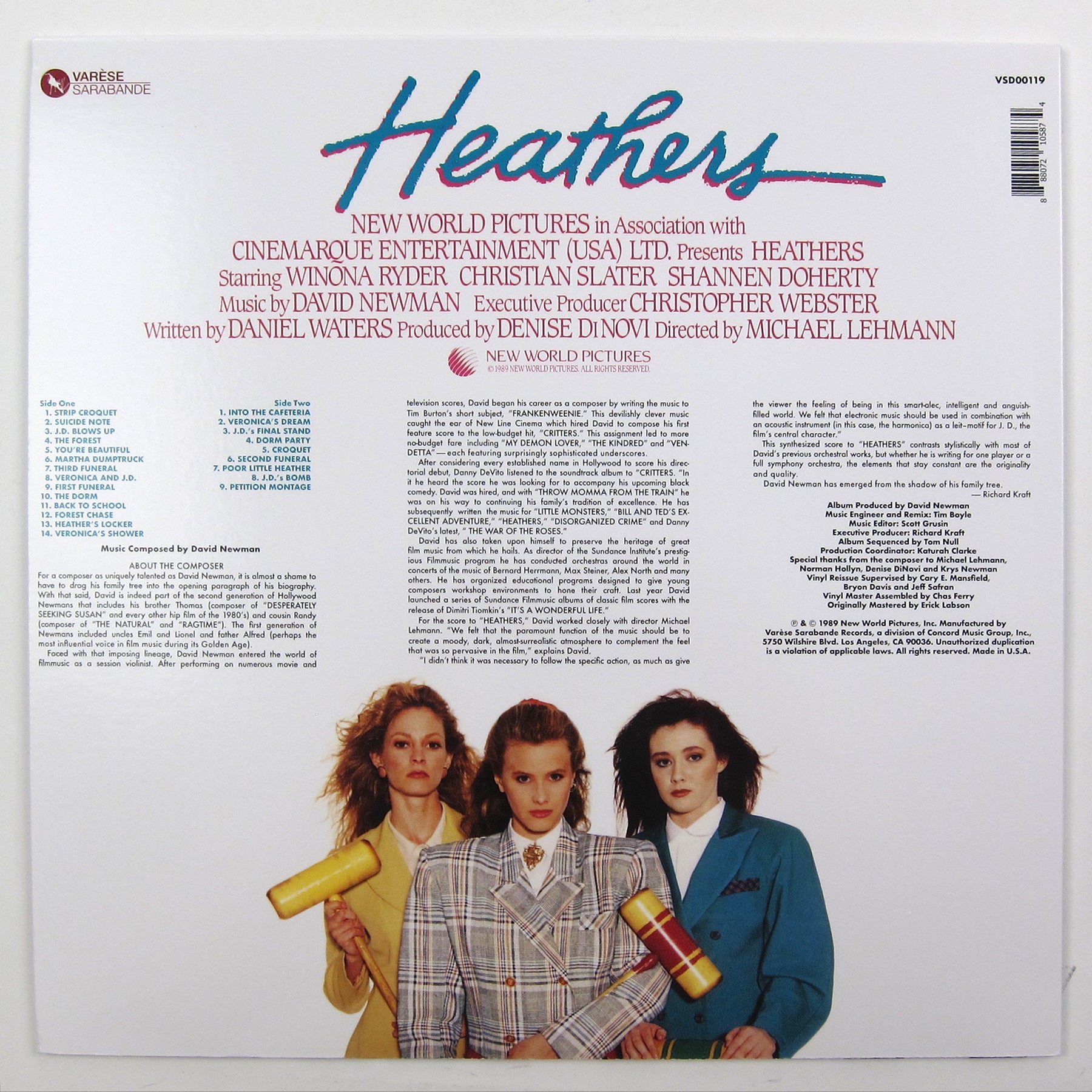 • How Very. Heathers is a dark comedy film written by Daniel Waters and directed by Michael Lehmann, but the producers' first choice was Stanley Kubrick. (The opening cafeteria scene was written as an homage to the barracks scene in Full Metal Jacket). A satire of American high school culture, the film is wickedly funny although it initially underperformed at the box office. The film succeeded in the home rental market, cementing it as an early career highlight for both Winona Ryder and Christian Slater. The film’s synthesizer-based score was composed by David Newman, who also scored films such as War Of The Roses, Bill & Ted’s Excellent Adventure, and Coneheads (in addition to about 100 others). Opening track “Strip Croquet” is filtered synth pads and harmonica, “J.D. Blows Up” is echoing claps and orderly electronic drums. “Dorm” is fiercely gated percussion and shimmering synth leads, “J.D.’s Final Stand” begins with eerily held chords but serves to bring together many previously individual elements of the score into one. Released in honor of the film’s 30th anniversary, this pressing is on “Very” neon green colored vinyl and includes a printed inner sleeve with liner notes.