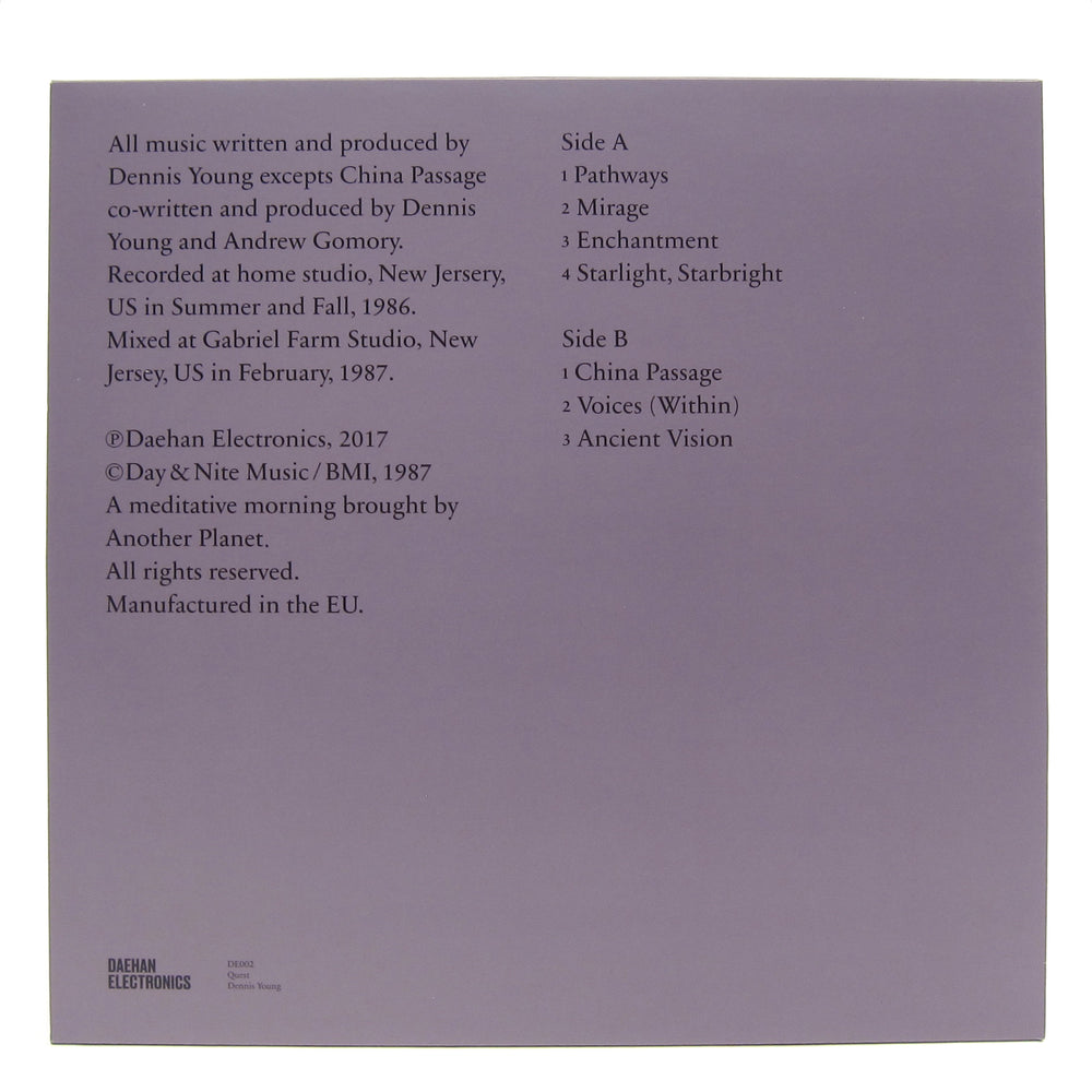 After the dissolution of NYC avant funk heroes Liquid Liquid, founding member and percussionist Dennis Young recorded a series of new age albums (as Dennis Andrew) which were released via limited cassette runs exclusively in South Korea. Fast forward to 2018 and Seoul-based revivalists Daehan Electronics have procured at least one of these albums for their first official worldwide release: Quest. Soothing, therapeutic and introspective; it’s a world away from the weirdo funk of Liquid Liquid, but listen closely to the cadences in “Cavern” or “Optimo” and you can hear the spectral kernel of Quest between the cracks. Tantric opener “Pathway” sets the vibe, and the labyrinthine underwater deepness of “Mirage” and cosmic new age twinkle of “Voices (Within)” are the high water marks, all peppered with Young’s own soothing incantations. Includes fold-out insert with archival photos and notes from Young about the album’s creation. Recommended.