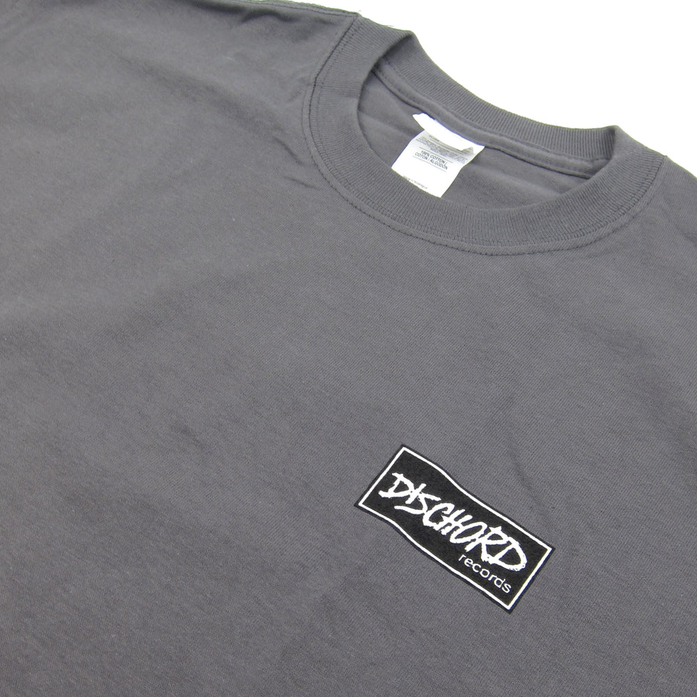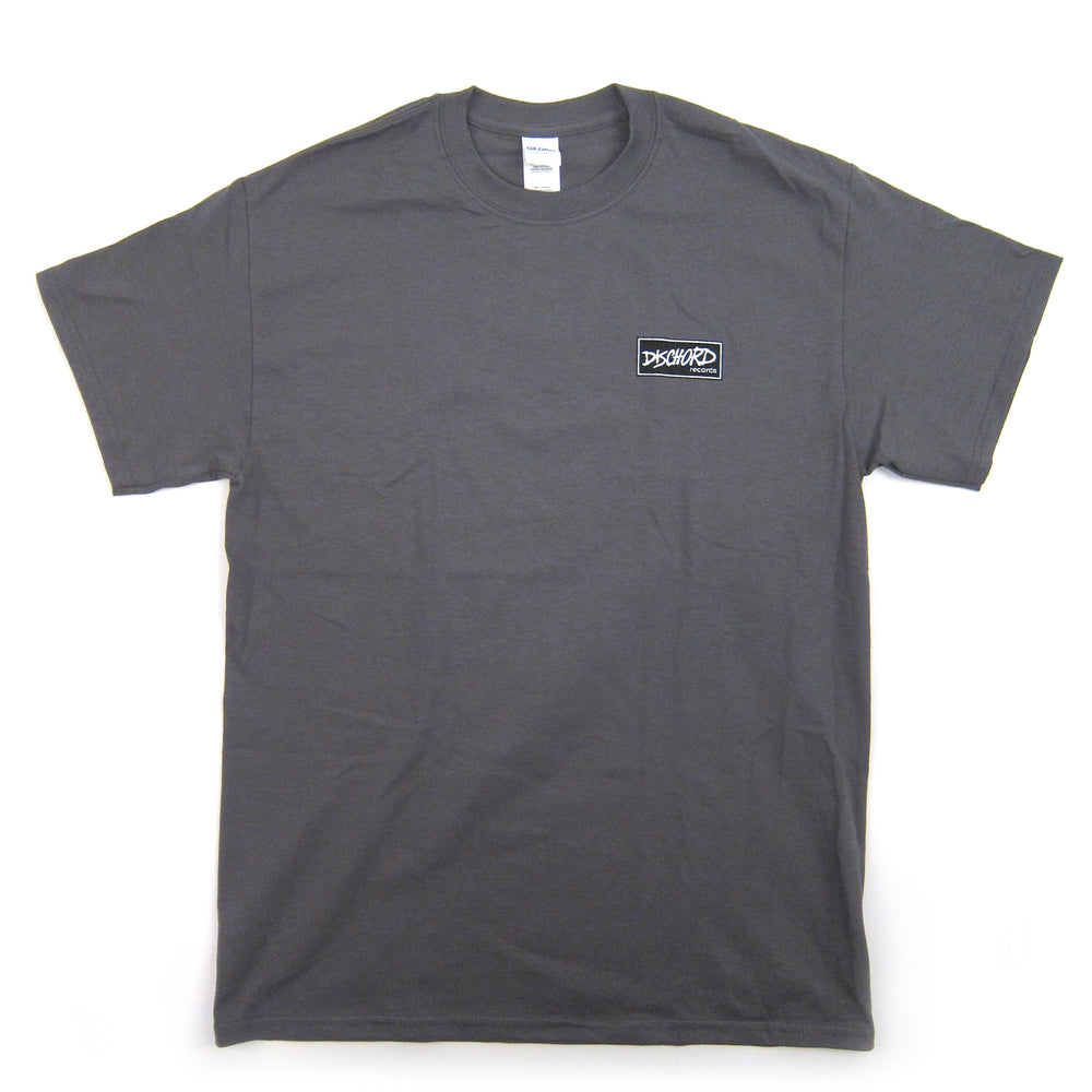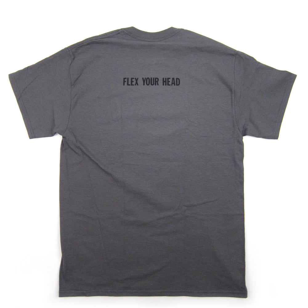Official box logo tee for Ian Mackaye's influential D.C. punk / DIY label that is home to Fugazi, Minor Threat, Government Issue, Rites Of Spring, Jawbox, Dag Nasty, Q And Not U and many others. Classic Dischord box logo on the chest with 'Flex Your Head' on the back, printed on 100% cotton charcoal tees with black & white ink.