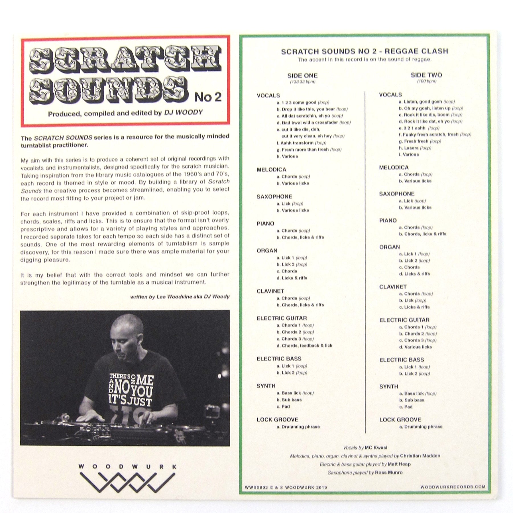 "It is my belief that with the correct tools and mindset we can further strengthen the legitimacy of the turntable as a musical instrument." Reload your scratch arsenal with the second volume of DJ Woody's most excellent Scratch Sounds series. Just like the first installment, No. 2 is a conceptual scratch tool designed to progress musicality in turntablism - but this time with a focus on reggae + dub aesthetics. The two-time world champ follows the footsteps of classic library music catalogues of the 60's and 70's, presenting a set of original recordings specifically designed for the scratch musician. This 12" version offers several skip-proof phrases ranging from vocal samples to chords and licks from various instruments (melodica, electric bass, synth, organ, etc.), with each side ending in a locked drumming phrase. Comes pressed on red colored vinyl, complete with pic sleeve. Also available in 7" format.
