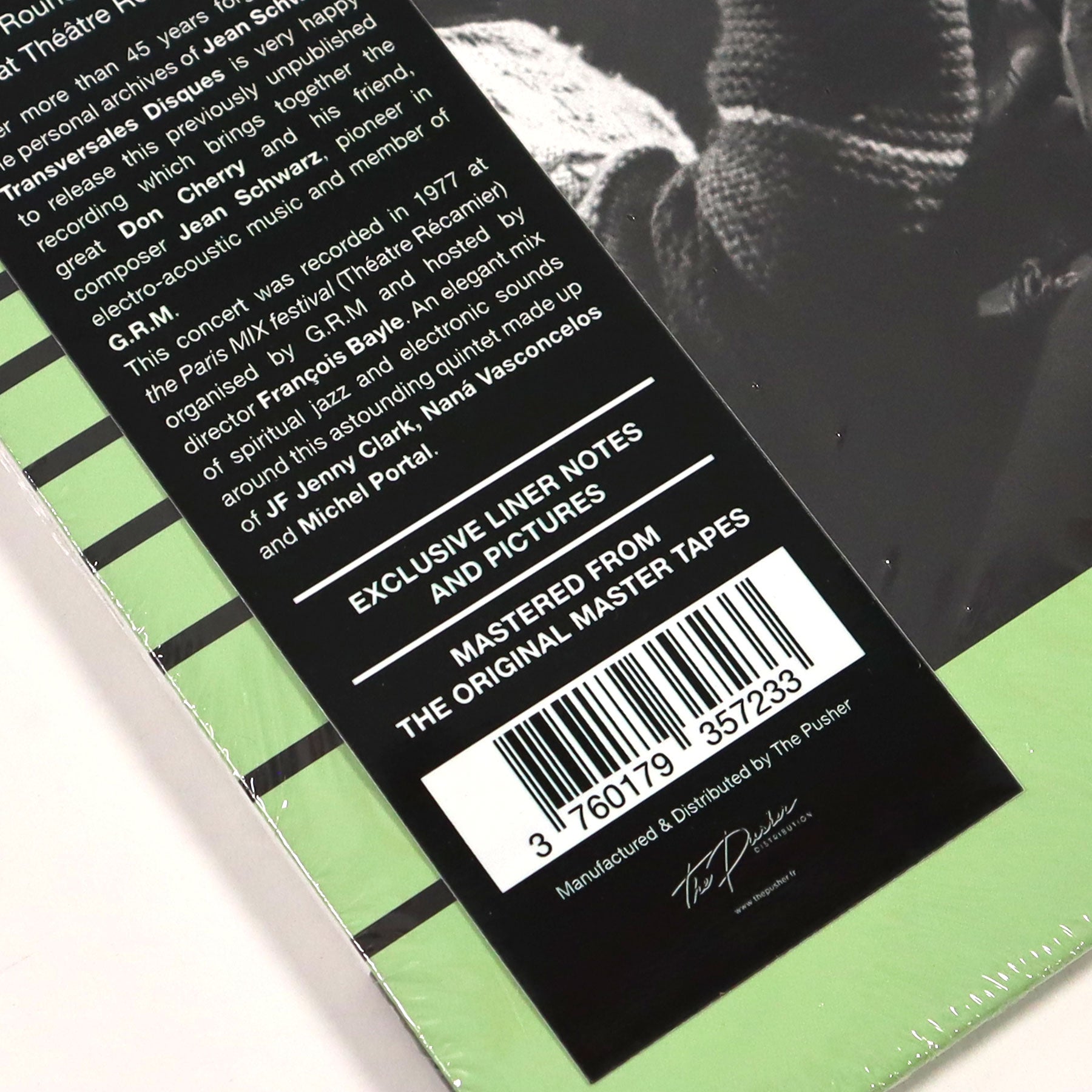 "After more than 45 years forgotten in the personal archives of Jean Schwarz, Transversales Disques is very happy to release this previously unpublished recording which brings together the great Don Cherry and his friend, composer Jean Schwarz, pioneer in electro-acoustic music and member of G.R.M. This concert was recorded in 1977 at the Paris MIX festival (Théatre Récamier) organised by G.R.M and hosted by director François Bayle. An elegant mix of spiritual jazz and electronic sounds around this astounding quintet made up of JF Jenny Clark, Nanà Vasconcelos and Michel Portal" - Transversales Disques
