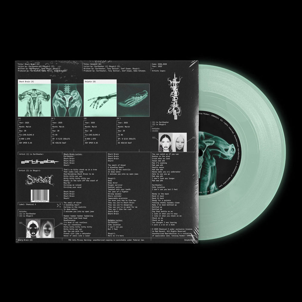 "Limited-edition 7" glow-in-the-dark vinyl double single (45 RPM), featuring lenticular cover artwork that changes imagery with the angle viewed. Actual pressing color and packaging may differ from mock-up photos. Critically acclaimed producer, vocalist, and multi-instrumentalist Eartheater teams up with London's breakout star Shygirl for new double single Shark Brain / Dolphin. Despite the longtime friendship and collaborative relationship between the two luminaries, this marks the first official collaborative release from the pair outside of remixes. The concept of Shark Brain / Dolphin came together due to the symmetry of the human anatomy with that of sharks and dolphins, which is reflected on the stunning lenticular cover artwork. 'Shark Brain' was produced by Eartheater alongside Andy Morin of Death Grips, while 'Dolphin' was produced by Eartheater alongside Tony Seltzer and Inef Coupe." - Chemical X