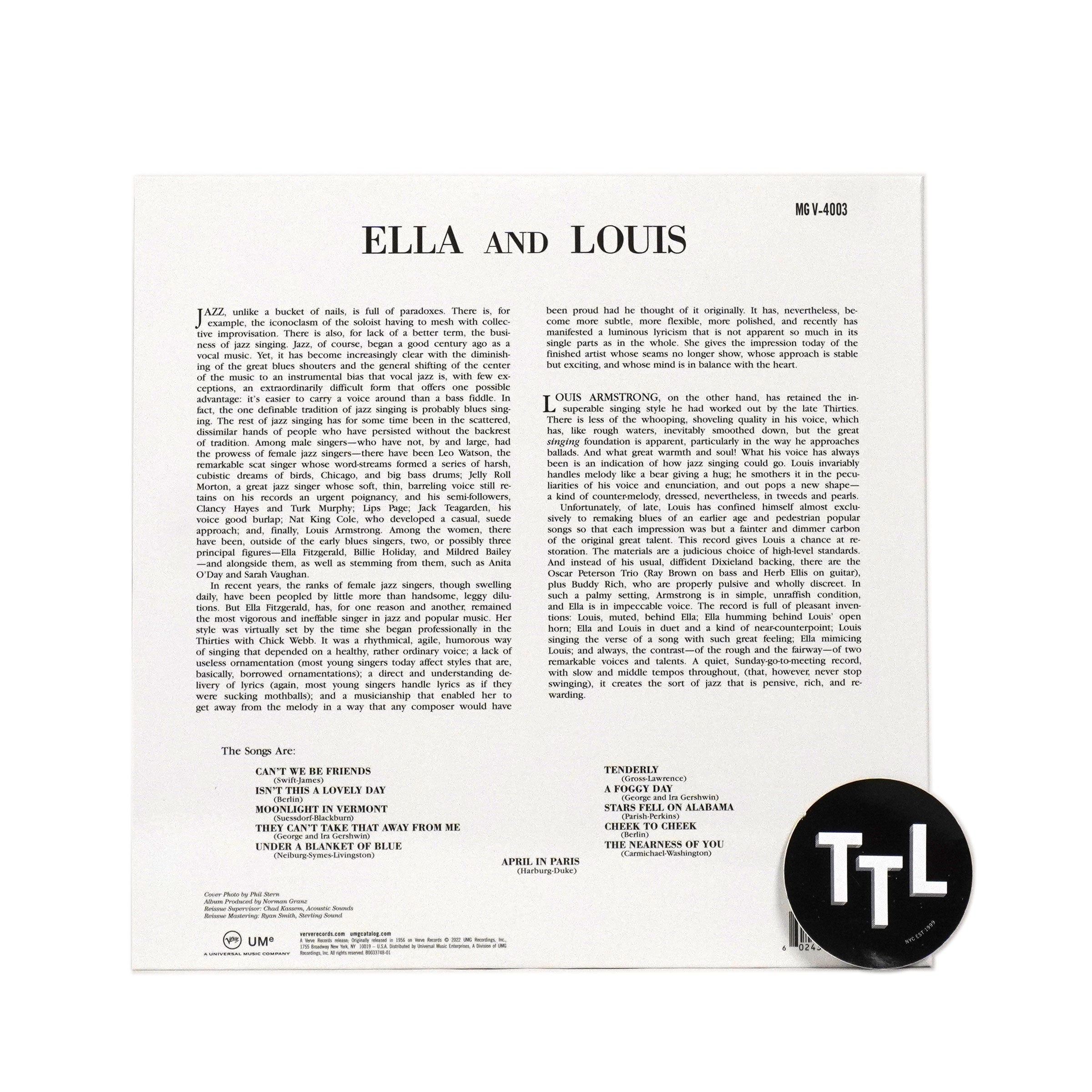 • "Vinyl LP repressing of this collaborative album between two of Jazz's greatest starts. The evening before Louis Armstrong recorded this album, both he and Ella Fitzgerald were appearing in an all-star concert also featuring Art Tatum and Oscar Peterson that was recorded for an album entitled Live at the Hollywood Bowl (1956). The following day the two singers, along with the Oscar Peterson Trio, were in a Los Angeles studio to record this gem of an album. With no time for rehearsals the songs were all set in Louis' key to make it easier, but this in no way inhibits Ella's performance. Another challenge for Pops was the fact that the material was not his normal repertoire, meaning he had to learn things on the fly in the studio. Again there's no hint of any issues, which all goes to highlight Armstrong's innate musical ability." - Verve Records