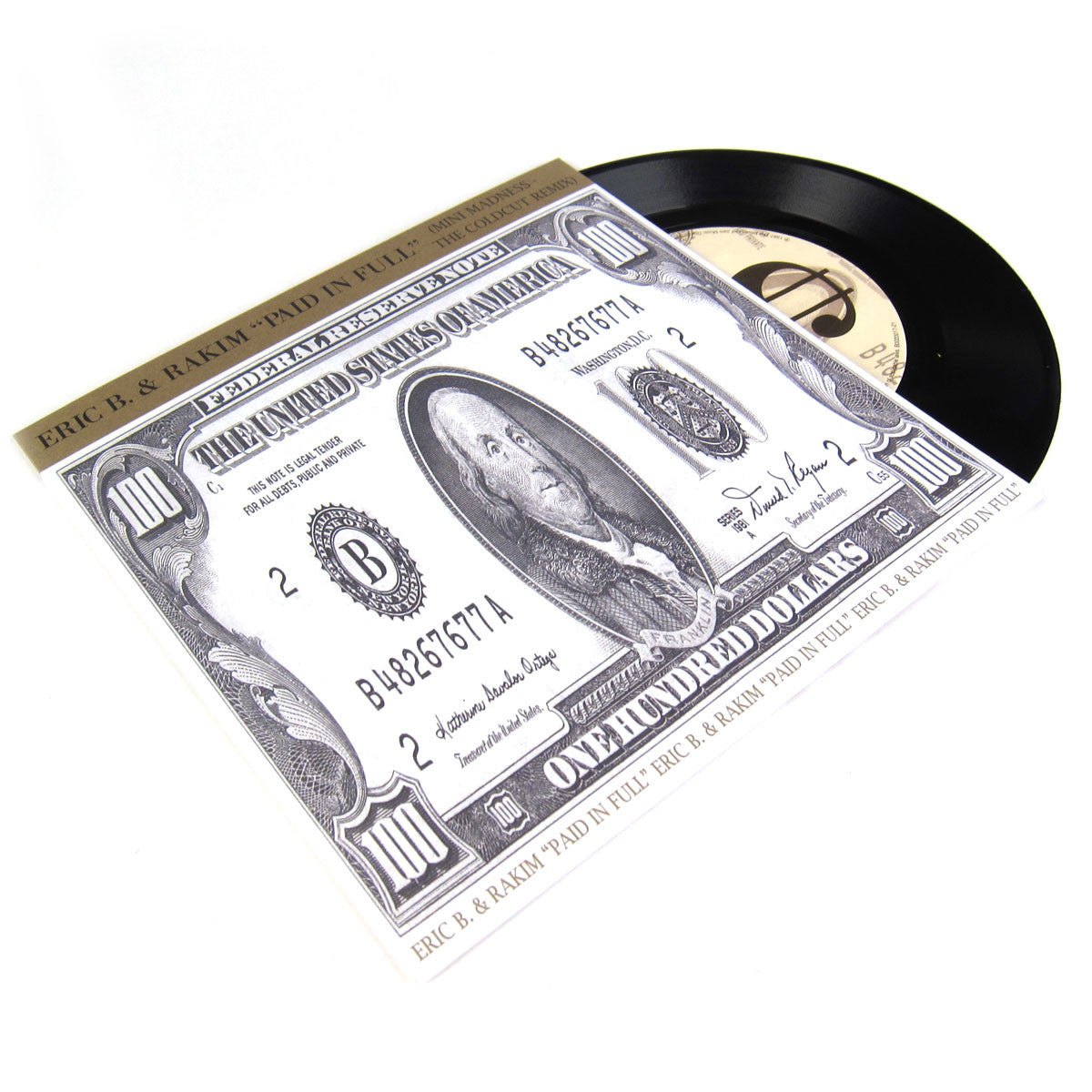This reissue of the UK version of Eric B & Rakim's Paid In Full 7-inch features the “Mini Madness” Coldcut remix in its entirety. This edition of the 45 was only released in the UK, where the Coldcut remix hit #15 on the charts. The song kick-started the international career of Israeli singer Ofra Haza and was the first time British voice actor Geoffrey Sumner's line, “This is a journey into sound,” was sampled. The 7-inch is housed in a full color reproduction of the original “100 dollar bill” cover art.
