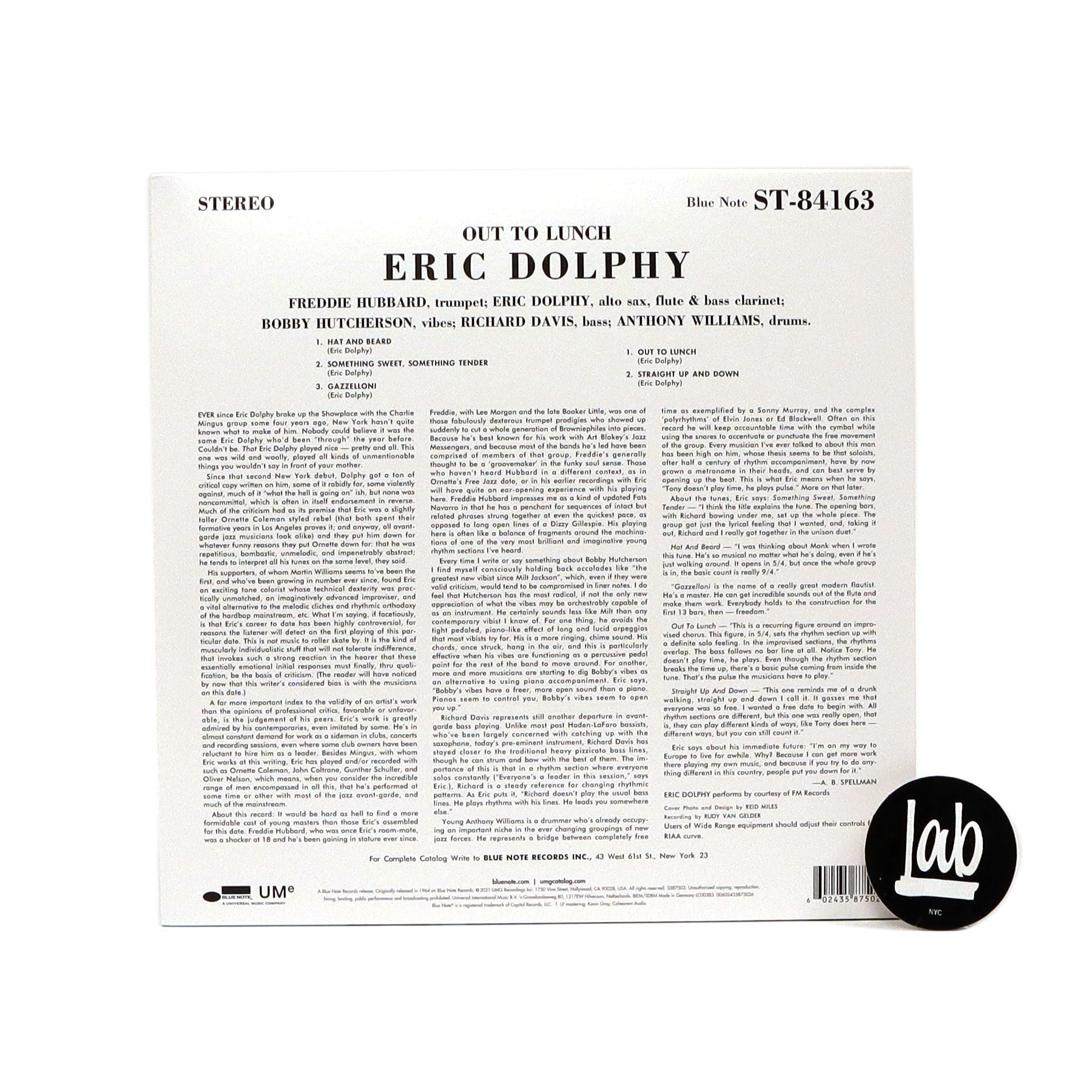 Eric Dolphy’s swan song; a free jazz masterpiece! Recorded only four months before his tragic death, Out To Lunch sees the jazz flautist at his virtuosic height, both as a soloist and as a bandleader. Alongside trumpeter Freddie Hubbard, vibraphonist Bobby Hutcherson, bassist Richard Davis, and drummer Tony Williams (who was only 18 at the time), Dolphy crafts complex rhythms and fantastic melodies that push the boundaries of the genre. Although the record was Dolphy’s lone release on Blue Note, it is widely considered to be one of the greatest releases by the legendary jazz record label. "Hat and Beard," "Something Sweet, Something Tender," "Gazzelloni," "Out to Lunch," and the drunken "Straight Up and Down" were all recorded in a single day at the legendary Van Gelder Studio just a few months before Coltrane would do the same with A Love Supreme. 5 tracks remastered on black 180g vinyl, recommended.