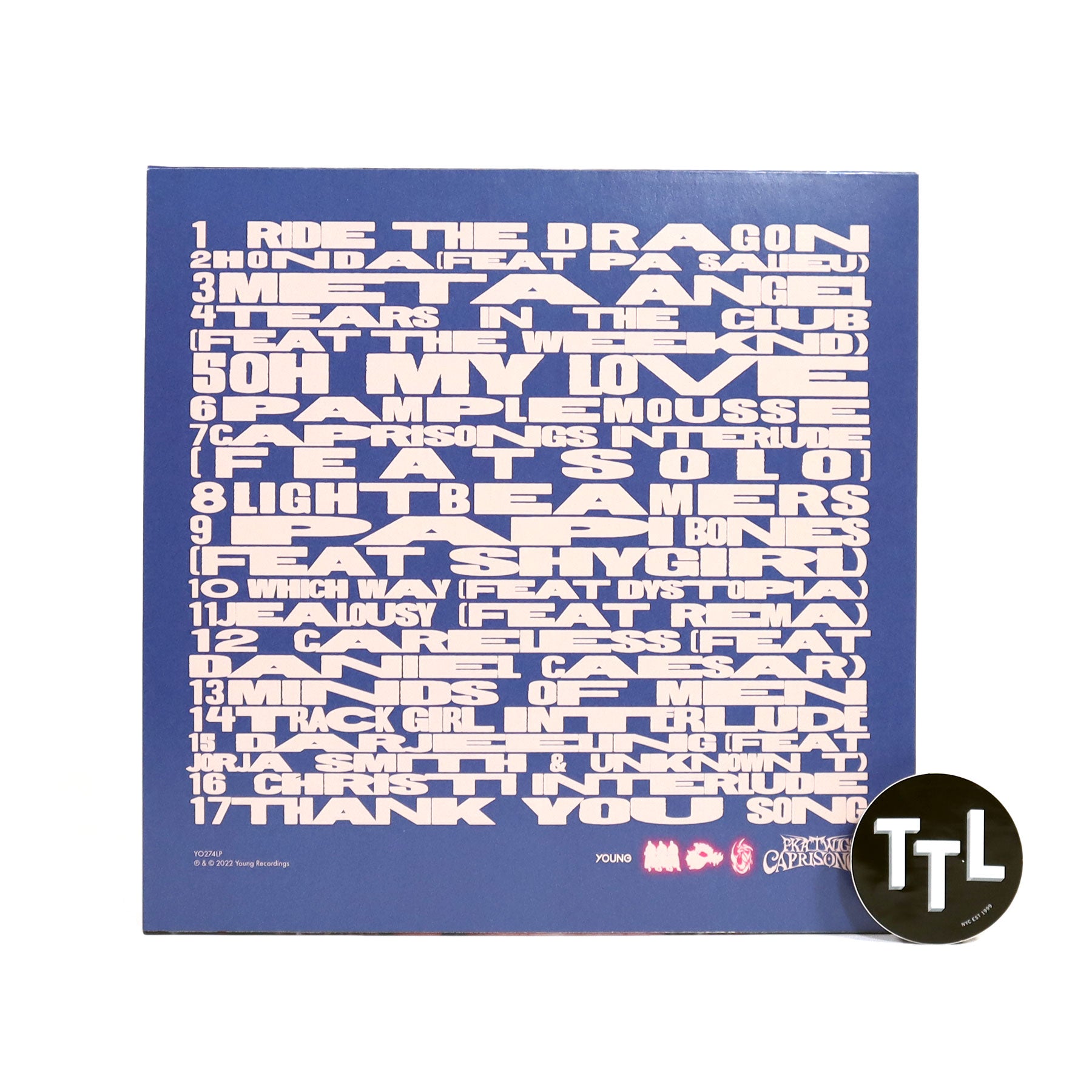 "FKA twigs’ highly anticipated mixtape CAPRISONGS is now on vinyl. The mixtape documents twigs’ 'journey back to myself through my amazing collaborators and friends' and showcases an evolution and expansion for this prolific artist who continues to thoughtfully push at the edges of her art. CAPRISONGS features collaborations with Pa Salieu (on 'honda,'), Daniel Caesar ('careless'), Rema ('jealousy'), Jorja Smith and Unknown T ('darjeeling'), DYSTOPIA ('which way') and Shygirl ('papi bones') in addition to the previously released single 'tears in the club', which saw twigs teaming up with The Weeknd for her biggest track to date." - Atlantic