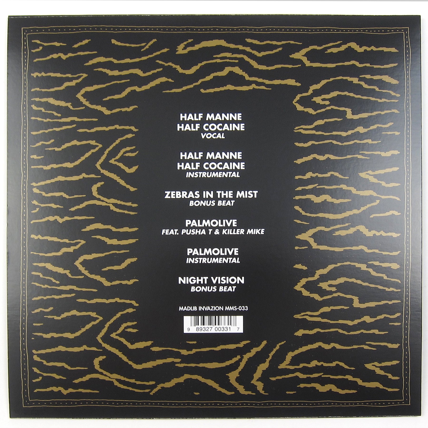 As the title suggests, Half Manne Half Cocaine is divided into two parts. Gibbs details his wealth and achievements in the first over an ominous, rattling trap beat, and the song switches to the Half Cocaine portion, on which the rapper lays down bars about his drug dealing x dirty money days. Madlib opts for a similar feel after the beat switch, with dark chords riding over a deceptively simple drum pattern highlighted by open hi-hat hits. Flip the record over for "Palmolive" featuring Pusha T and Killer Mike, instrumentals for both included as well as previously unreleased "Zebras In The Myst" and "Night Vision." Two standout tracks from the critically acclaimed Banadana + Madlib bonus beats, SAY NO MORE.