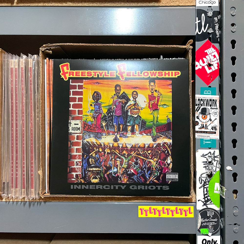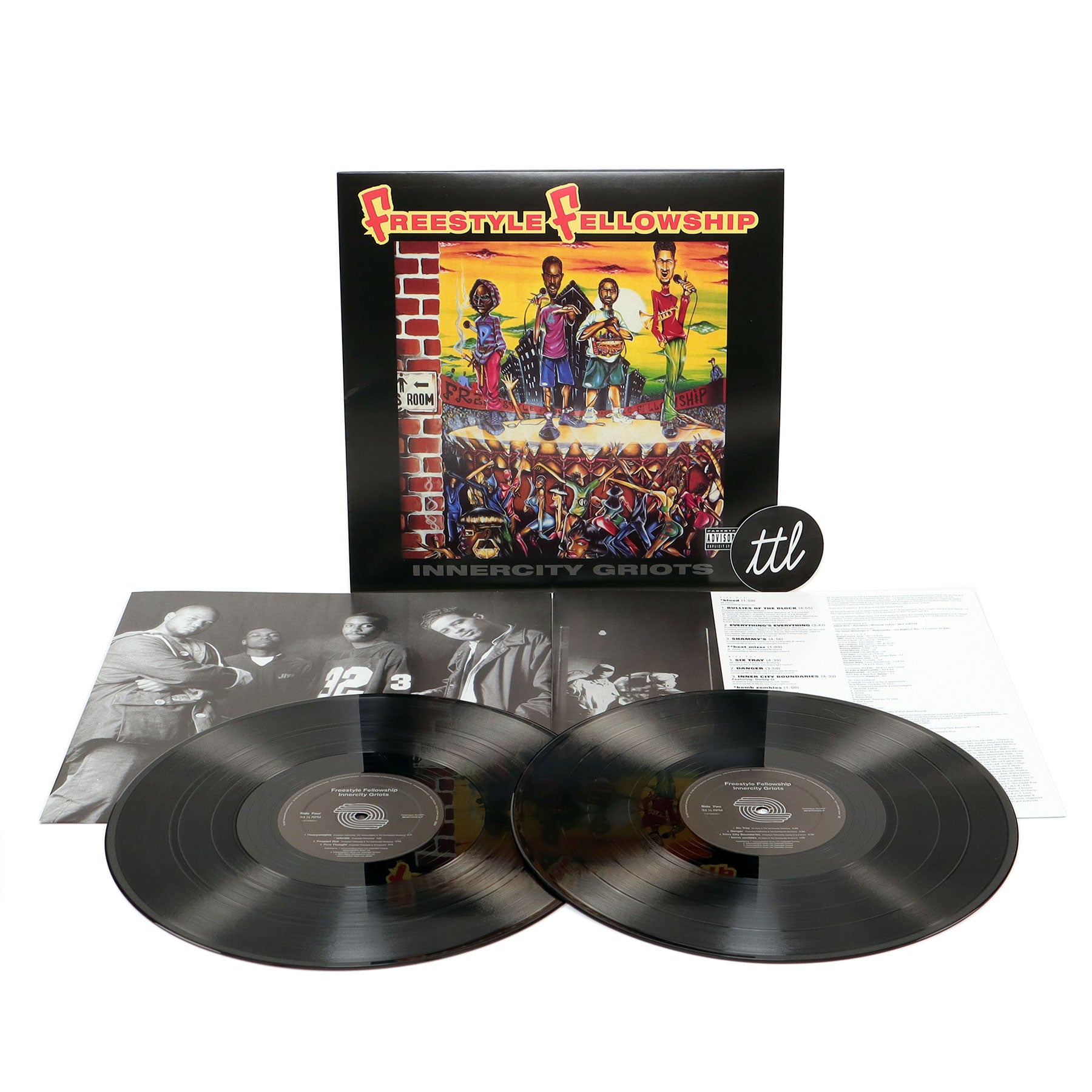 "Innercity Griots, the second album from Freestyle Fellowship, is perhaps the essential West Coast left-field rap album of the early '90s. Released in 1993 on 4th & Broadway, it's a towering, progressive hip-hop masterpiece that expanded rap's boundaries through lyrical elevation and production innovation. Their talent was ahead of everybody else by light years. This is pure b-boy jazz. Be With reissue includes 'Pure Thought' from the CD version of the album. Freestyle Fellowship were some of the earliest technically dazzling rappers to come out of California. Mikah 9, P.E.A.C.E., Aceyalone and Self Jupiter -- along with DJ Kiilu -- forged their famed lyrical dexterity in the ultra-competitive crucible of the Good Life Cafe. Founded in Leimert Park, South Central LA in December 1989, this earthy health-food store and cafe was where the city's finest microphone fiends would gather to showcase their freestyle skills at the Thursday night open-mic. Innercity Griots has been described as the Rosetta Stone for rap styles. The group's dense, vibrant wordplay and enviable interplay quickly earned the attention and respect of the city's hip-hop underground. Frenetically trading acrobatic rhymes with agility and grace, the Fellowship used their voices as instruments like true virtuosos, spraying improvised raps like a Coltrane sax solo. With the bulk of the album's production handled by The Earthquake Brothers, and Bambawar, Daddy-O, and Edman taking over for some of the tracks, Innercity Griots dances between organic and programmed music, largely forgoing sampling and instead built around live jazz jams. The likes of Freddie Hubbard's 'Red Clay' and Miles Davis's 'Black Comedy' were used more as templates for house band The Underground Railroad Band to spiral out from. The unusual approach to the music was matched by the Fellowship's lyrics. Eschewing the tired rap tropes of the time, this multifaceted album instead explores their ruminations on greed and homelessness, weed, sex, survival, insecurity and tribalism. Remastered by Simon Francis, cut by Pete Norman." - Lewis Taylor