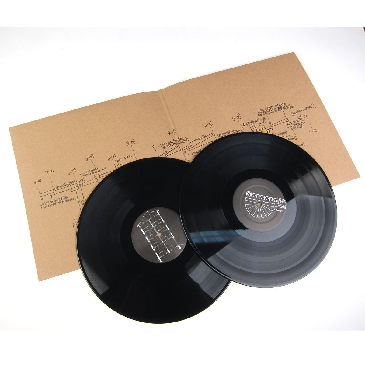 Sophomore studio album from Montreal's Godspeed You! Black Emperor. Lift Your Skinny Fists Like Antennas To Heaven was originally recorded in February of 2000 and documented the creative evolution of the band since their debut on Canada's Constellation Records, F♯ A♯ ∞. There are five distinct movements that are framed by field recordings which recall the narrative sonic collage techniques of their first record. Each side is a seamless flow of orchestral rock that slowly unfolds over time. The album is loaded with dynamics and unexpected turns as sonic textures are juxtaposed against each other. The inner panels of the album's sleeve contain a diagram drawn by Godspeed!'s Efrim Menuck that represents each movement. Released by Constellation Records with a gatefold sleeve.