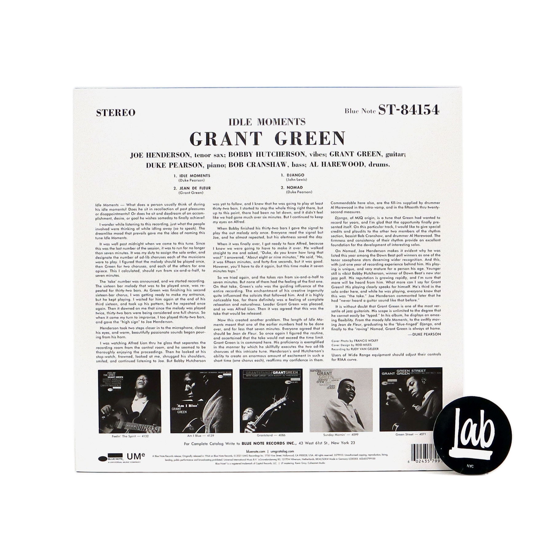 "Time and troubles seem to melt away during the 15 enrapturing minutes of Idle Moments, the opening track of Grant Green’s sublime 1963 album of the same name. As the piece unhurriedly unfurls all the unique colors of the ensemble present themselves with Green’s soulful guitar joined by Duke Pearson’s elegant piano, Bobby Hutcherson’s crystalline vibraphone, Bob Cranshaw’s reassuring upright bass, Al Harewood’s subtle drums, and lastly Joe Henderson’s magnificent tenor saxophone. The pace quickens for the rest of this set including the Green original 'Jean de Fleur,' a bluesy take on John Lewis’ MJQ standard 'Django,' and Pearson’s original 'Nomad.' This Blue Note Classic Vinyl Edition is all-analog, mastered by Kevin Gray from the original master tapes, and pressed on 180g vinyl at Optimal." - Blue Note Records