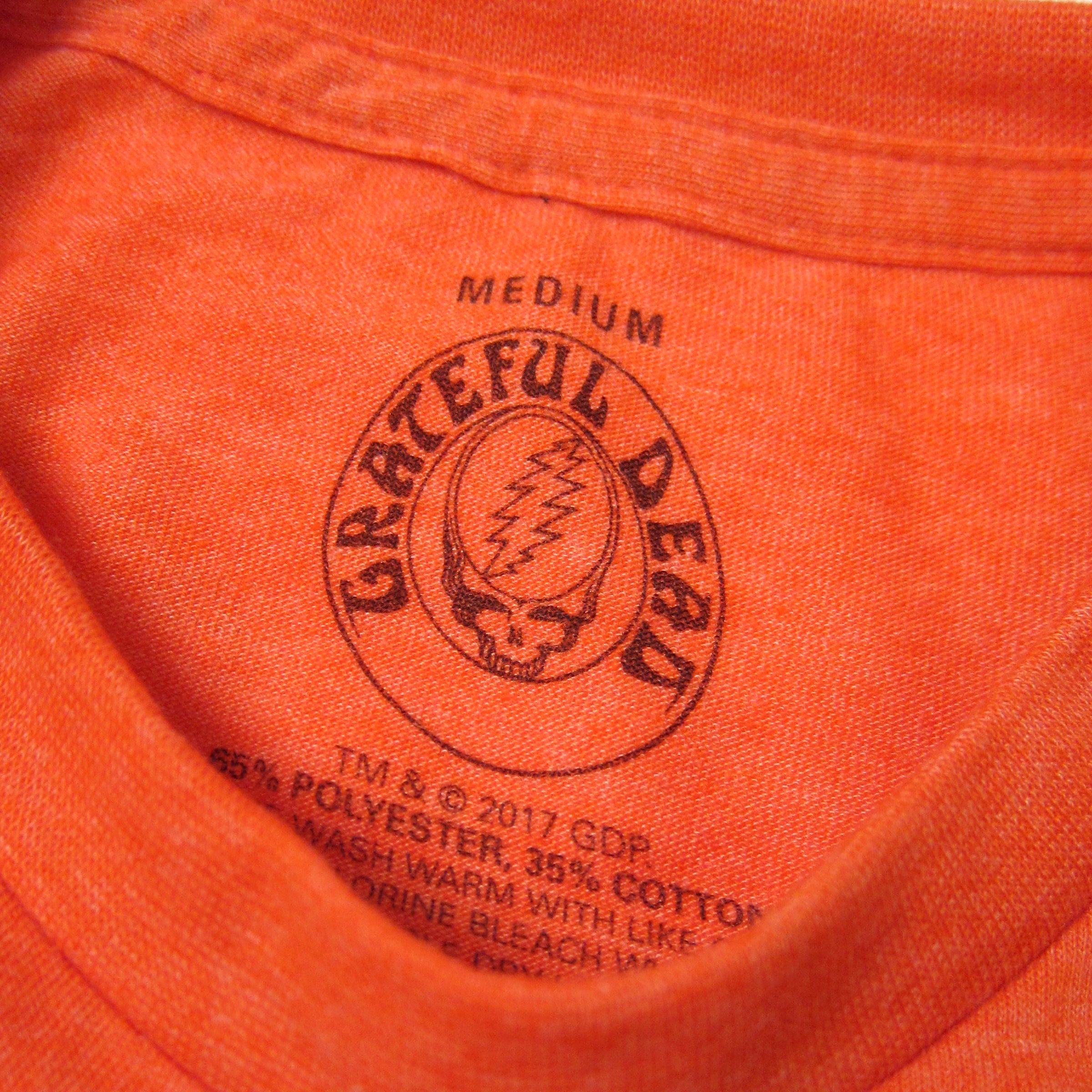 Official Grateful Dead logo tee featuring a rose-adorned Bertha skeleton on bright, all cotton, orange tees.