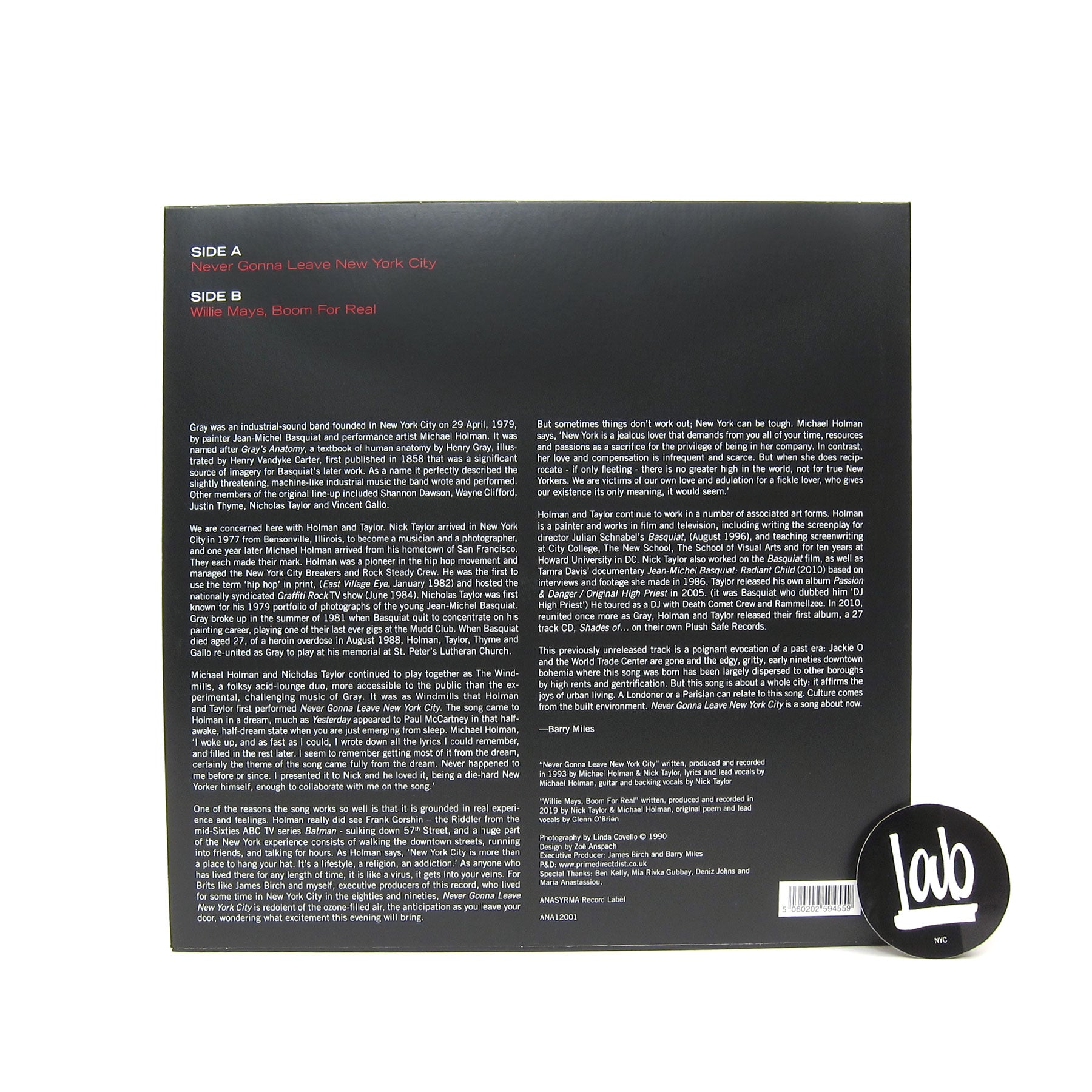 "Formerly unreleased, super-rare tracks from the original New York scene, art-house band Gray originally fronted by the legendary artist Jean-Michel Basquiat. A slice of the Lower East Side New York grounded in real experiences, real feelings and the joys of urban living, expressed through the tracks ‘Never Gonna Leave New York City’ & ‘Willie Mays, Boom For Real’ from founding Gray member Michael Holman and bandmate Nicholas Taylor. These 2 songs come in a stunning full color sleeve with liner notes from rock biographer BARRY MILES." - Anasyrma