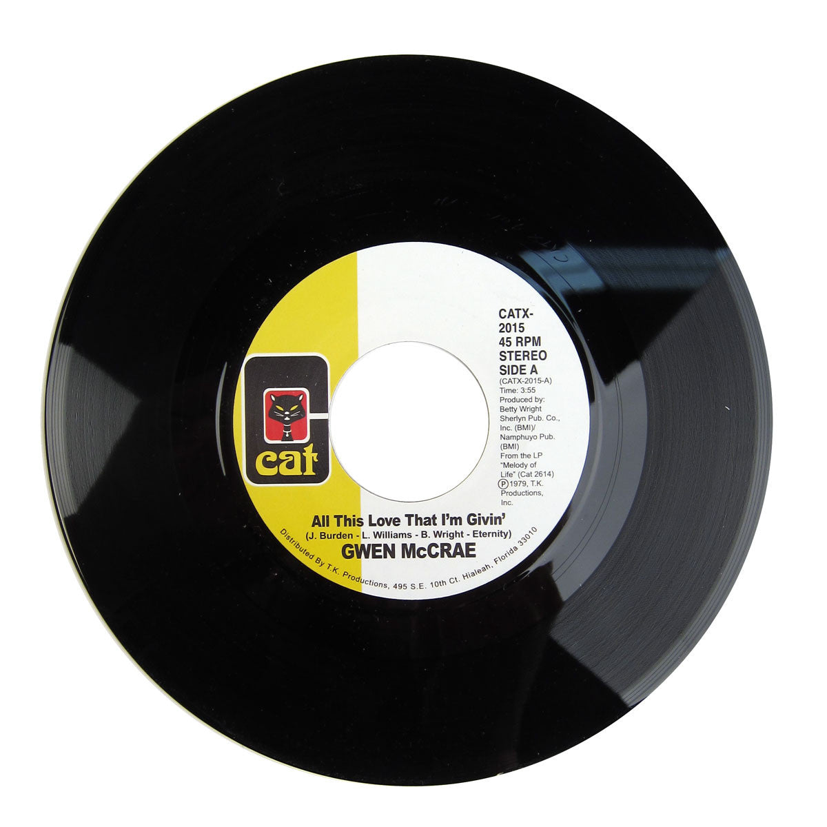 Got damn that's funky! Gwen McCrae delivers nothing but heat on this here slab of wax. Originally released in 1979, "All This Love That I'm Givin" is sure to send chills down your spine with its incredibly sexy soul-funk groove. Click that sound sample and you'll be saying "Woo!" too. The flipside chills out the vibe with "Maybe I'll Find Somebody New," for that mellow-mellow-right-on feeling. Both sides produced by fellow female soul sensation Betty Wright. 2015 remastered repress on legit Cat labels.