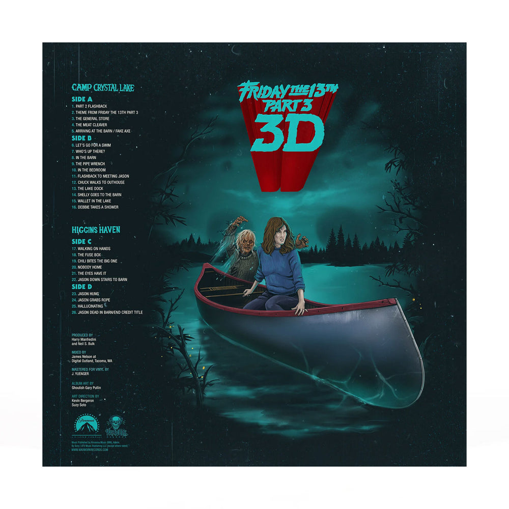 "Waxwork Records is proud to announce the next entry into their collection of FRIDAY THE 13TH soundtrack releases on vinyl, FRIDAY THE 13TH PART 3. Waxwork and composer Harry Manfredini re-visited the original analog tapes in an effort to faithfully master the complete soundtrack for vinyl. Originally released in 1982 and in 3-D, FRIDAY THE 13TH PART 3 is the first film to feature the legendary slasher, Jason Voorhees, wearing his signature hockey mask. This image of a machete wielding, hockey masked killer became the trademark for the franchise, as well as an iconic image in American cinema and horror films in general. To keep in tune with the original 3-D theatrical release of the film, Waxwork created a deluxe quality 3-D lenticular mounted album cover for the heavyweight old-style tip-on gatefold jacket which houses two LP's featuring the complete score. And yes, this soundtrack release includes the now famous "Disco Theme" from FRIDAY THE 13TH PART 3's opening credits! " - Waxwork Records