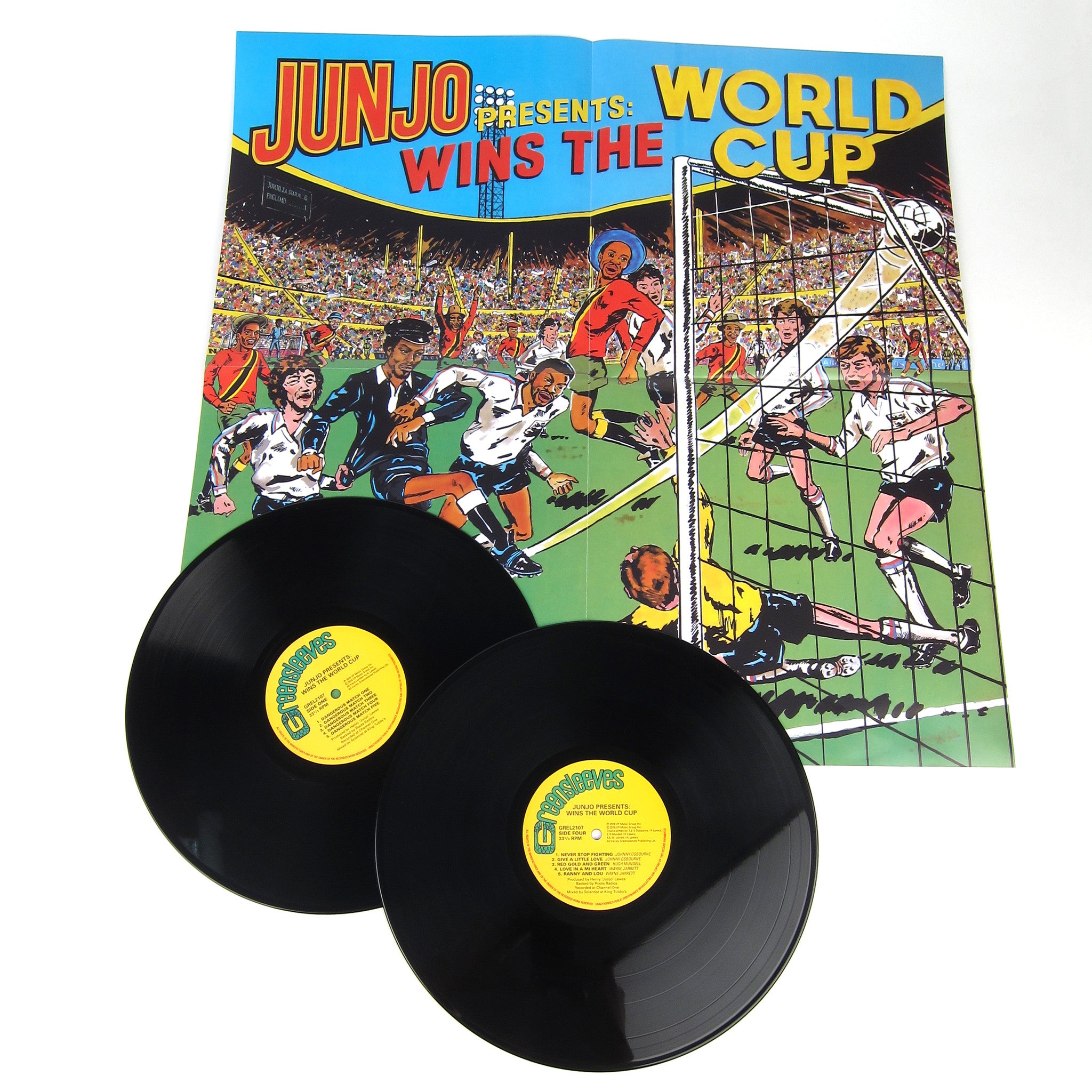If there's one really crucial Scientist on Greensleeves other than "Rids The World," this is it. Wins The World Cup features Scientist at his loosest, in full command of super effects, vocals, layering and just adding bone crushers onto every riddim. Listen to the sample for the dub of "Jacqueline." Roughness! Girl you want discipline. I'm also loving the dub of Johnny Osbourne's "Over 21," Scientist perfect with the vocal cuts, dropping the rhythm in and out like only he can. On the smoother side, the dub of Hugh Mundell's "Red Gold and Green" has always been a favorite and his treatment on Johnny Osbourne's "In Your Eyes" is miles above the semi-annoying vocal version, floating off into space just the way it should be. As usual, production is by Junjo, riddims by the Radics, engineered at Tubby's. Dubs come from Wayne Jarrett (Chip In), Johnny Osbourne (Never Stop Fighting), Hugh Mundell (Mundell). This special 2016 reissue includes a bonus disc including all the original vocal versions with completely remastered sound and huge foldout poster. Official VP pressing with glossy sleeve - this is the version to own!