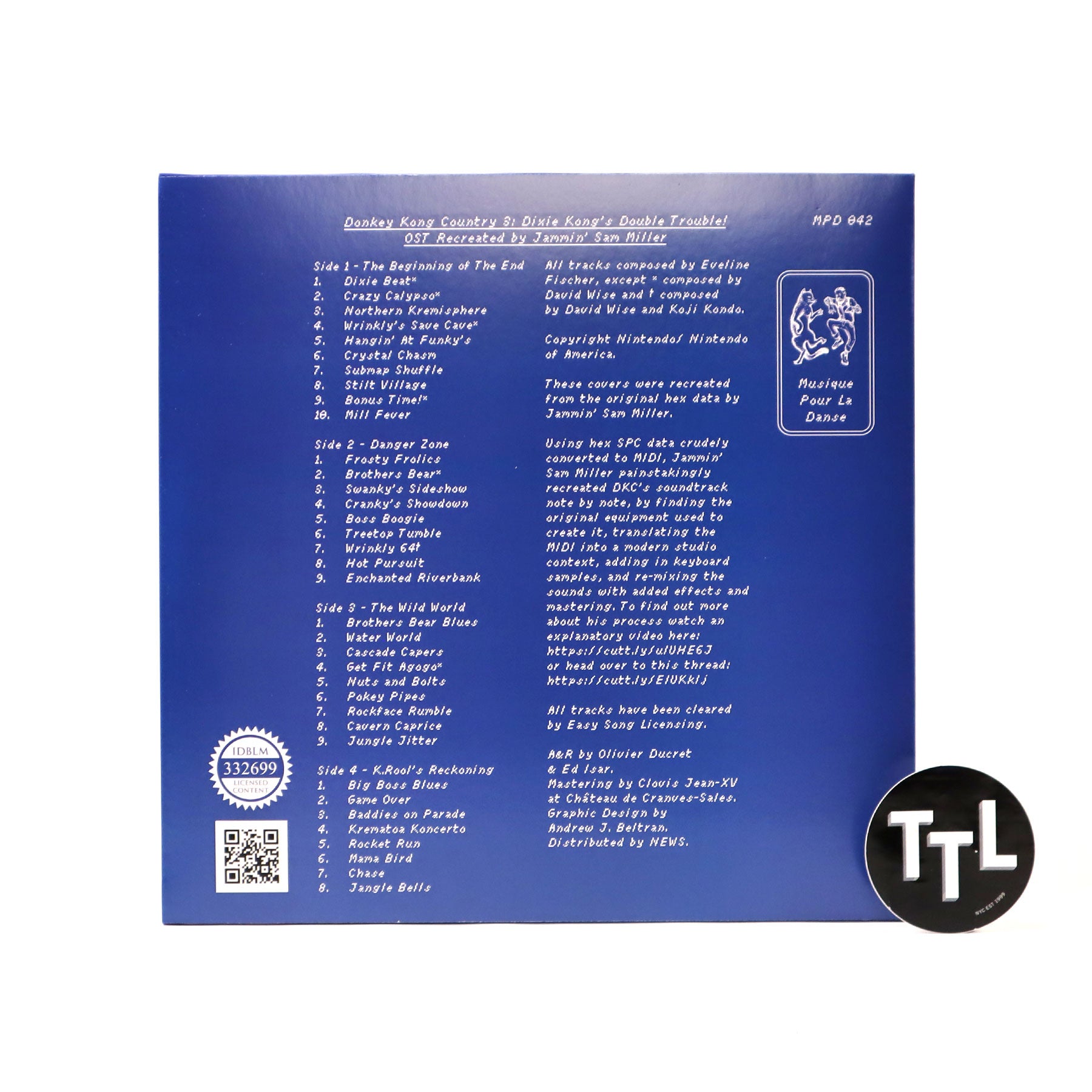 "Musique Pour La Danse is proud to present its first release in the field of video game OSTs, with the first-ever physical release of the much appreciated and globally followed Donkey Kong Country OST recreation project led by Louisiana-based composer and producer Jammin’ Sam Miller. Using hex SPC data crudely converted to MIDI, Jammin' Sam Miller painstakingly recreated DKC's soundtrack note by note, by finding the original equipment used to create it, translating the MIDI into a modern studio context, adding in keyboard samples, and re-mixing the sounds with added effects and mastering. Remastered for vinyl, licensed, and presented in a limited edition blue cascade double LP." - Musique Pour La Danse