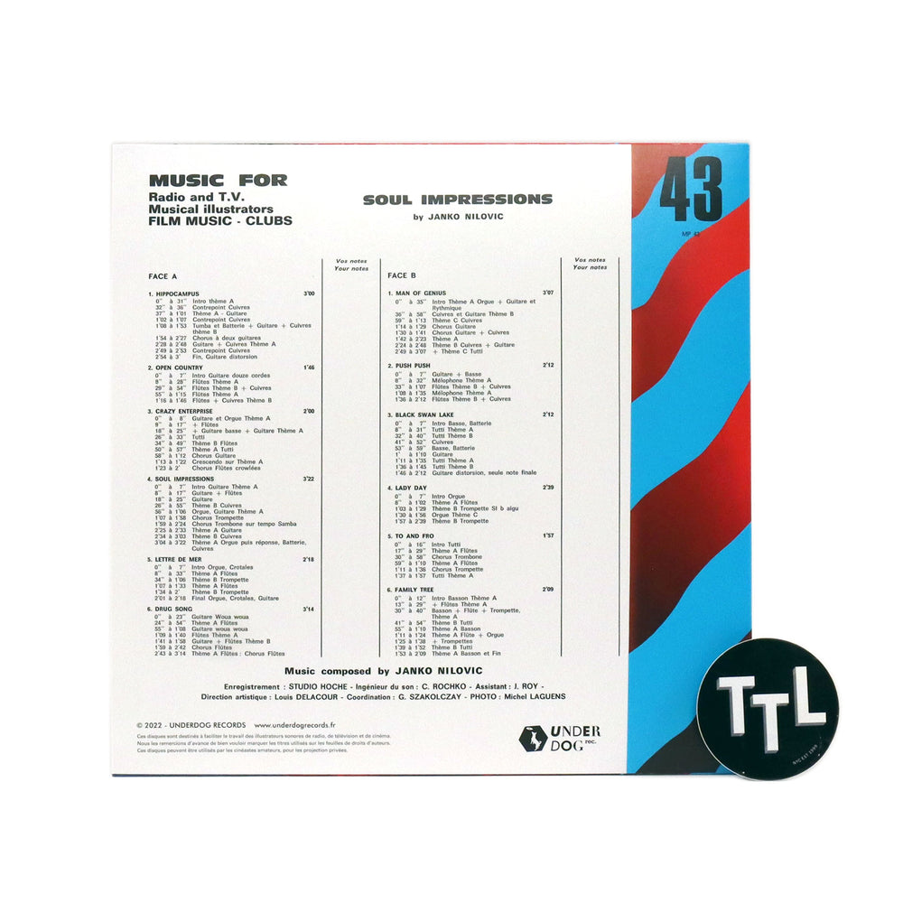 "Recorded in 1975 and released on the legendary library music label Montparnasse 2000, Soul Impressions condenses the entire mastery and inspiration of the brilliant Franco-Yugoslav composer Janko Nilovic into 12 generous tracks. A total adept when it comes to bubbling studio sessions and gleaming arrangements, our man incessantly works furiously and devotedly on his music, throwing himself body and soul into the creation of one of the 70s most individual and coherent musical works. A chameleon of a composer, capable of adapting to practically all styles of music, he uses the diversity of his inspirations to stoke his creative pulsations which shape each of his compositions. On Soul Impressions we discover an incredible kaleidoscope of influences which diffract musical perspectives: here pop dives into torrents of fuzz, funk takes on a psychedelic air, jazz flirts with rock, and easy listening contorts strangely into the baroque. Between a joyful Blaxpoitation aesthetic (flute, wah-wahs and roaring bass), great surges of almost progressive acid (killer riffs and spiralling solos) and surprising breaks in tone and rhythm, Nilovic gets the balance right and gives what might have remained a simple library record the solid foundations of a coherent album. Time has made a eurogroove classic of Soul Impressions, maintaining its high value on the collectors’ market and remaining one of the most sought out records in Janko Nilovic’s however extensive discography." - Underdog Records