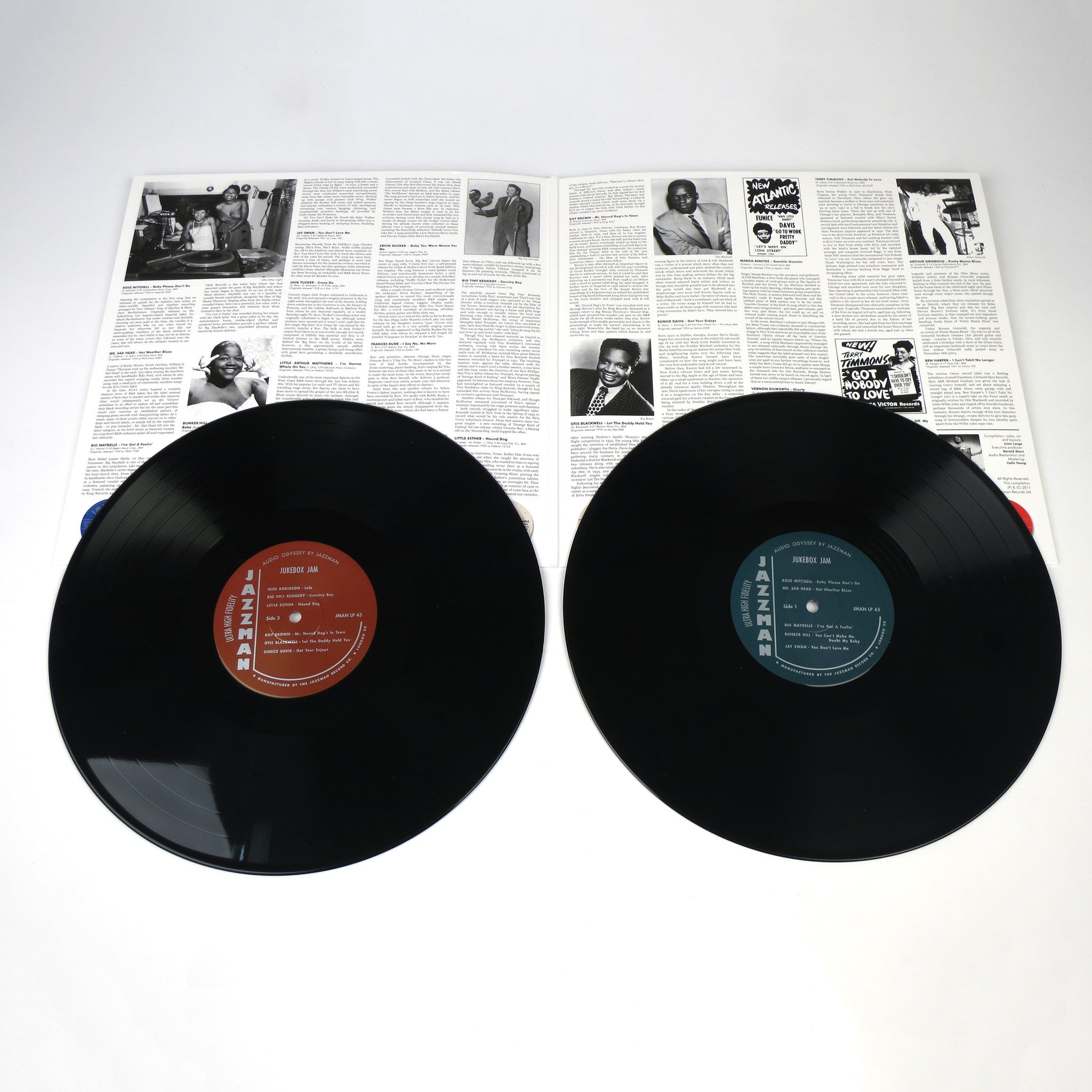 DJ Liam Large started The Jukebox Jam club night in 2007. A monthly gathering centered around "authentic US rhythm & blues," the party helped the "slow but steady spread" of similar nights and in the process began reissuing, as limited edition 45s, "hard to find, under-exposed, forgotten r&b obscurities" in conjunction with Jazzman Records. Jukebox Jam!: Blues and Rhythm Revue pulls from the 45 series with Liam adding 8 more songs, with tracks from the likes of Etta James (r.i.p.), Frances Burr, Big Maybelle, Jack Tucker, Eunice Davis, Terry Timmons, Barga Benitez and more promising to "get you off your feet and moving." 22 tracks in all. Released by Jazzman on double vinyl with extensive original liner notes and never-before-seen pictures.