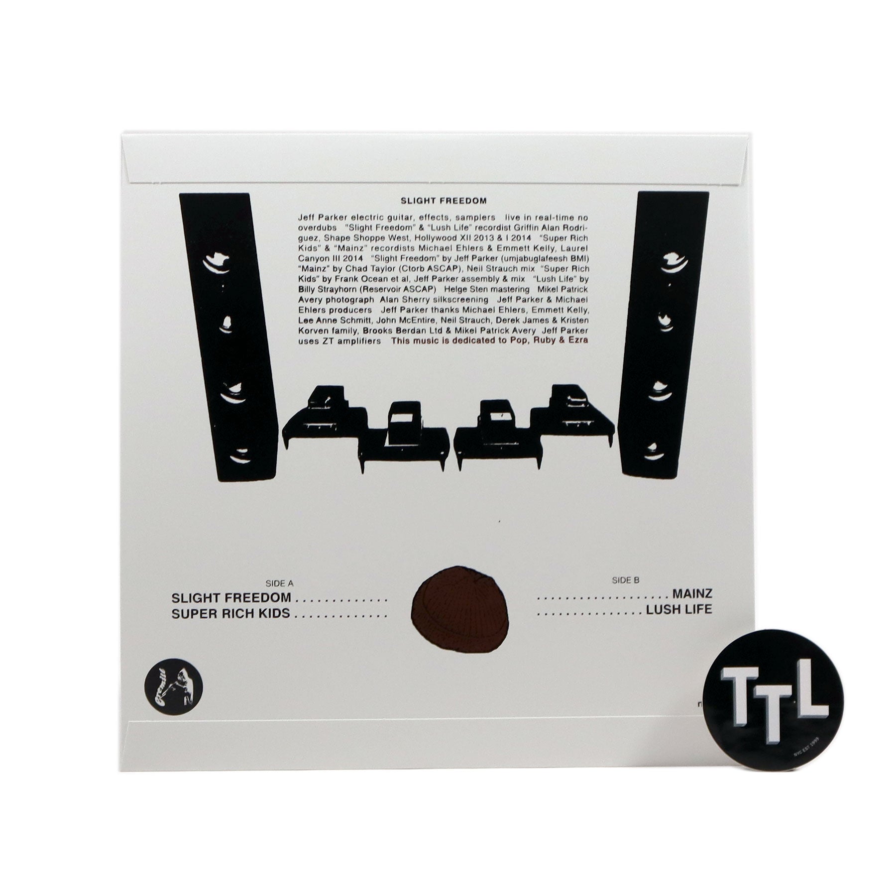 "Slight Freedom, Jeff Parker's first ever solo record, presents the first opportunity to hear the guitarist in fully self-revealed circumstances. recorded 2013 & '14 in the Hollywood Hills as he relocated from Chicago to Los Angeles, Parker combines the dark tonal palette & percussive attack he's long been known for with real-time processing elements & field recordings, deftly crafting a unique world of solo guitar music -- multilingual, mysterious, alive with extraordinary sonic events, with a sturdy intelligence in charge & a raw homestyle vibe. parker's title composition sets the album's cavernous mood. terse lines & ricocheting loops morph into a gnarly ambient section that resembles Neil Young droning out over a VG+ copy of Discreet Music. Parker creates a different sort of ambient space in his take on Frank Ocean's 'Super Rich Kids', bending the melody around a bossa nova rhythm into a moodsville tone poem. parker makes an extraordinary long-form statement out of Chad Taylor's 'Mainz', a piece he first recorded with Taylor & Chris Lopes on the album Bright Light In Winter. Twice the length of the trio recording, the multi-layered soliloquy finds parker leaping from the high rung to damn near orchestral heights, pushing his techniques & concepts to the breaking points. It's one of the great solo performances you'll hear from a musician this year. To say 'Lush Life' comes with formidable baggage is an understatement. Parker achieves instant classic status with a rendition that sounds beamed-in from a decommissioned satellite -- burned out, covered in space grit, yet still formally nuanced & beautifully reflective of Strayhorn's world-weary lyrics. twenty years into the game it's a joy for eremite to present work by an artist who's clearly taking his music to the next level. The long awaited repress is here, pressed on premium 120-gram audiophile-quality vinyl by RTI from lacquers cut at sterling sound by Steve Fallone, presented in a retro flipback jacket. Second edition of 1,399 copies." - Eremite