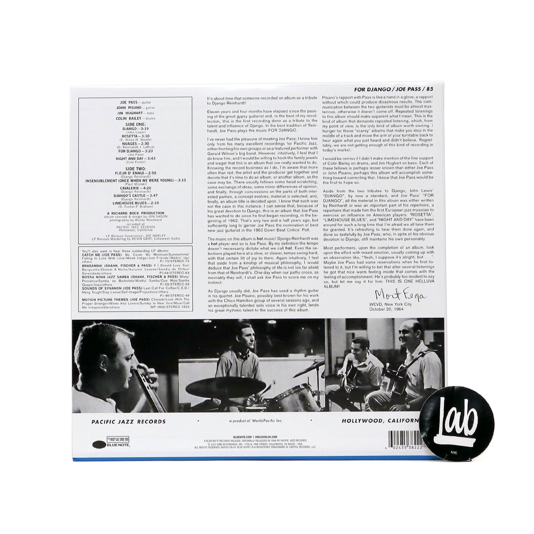 "Joe Pass’ For Django, recorded for Pacific Jazz in 1964, has long been considered a classic of the jazz guitar repertoire with Pass paying tribute to Django Reinhardt without in any way attempting to emulate him. Rather, Pass honors Django using his own masterful guitar style joined by fellow guitarist John Pisano as well as bassist Jim Hughart and drummer Colin Bailey. Highlights in this program of tunes either composed by or associated with Django include 'Rosetta,' 'Nuages,' and 'Fleur D’ Ennui.' All-analog, mastered-from-the-original-master-tape 180g audiophile vinyl reissue in deluxe packaging." - Blue Note Records