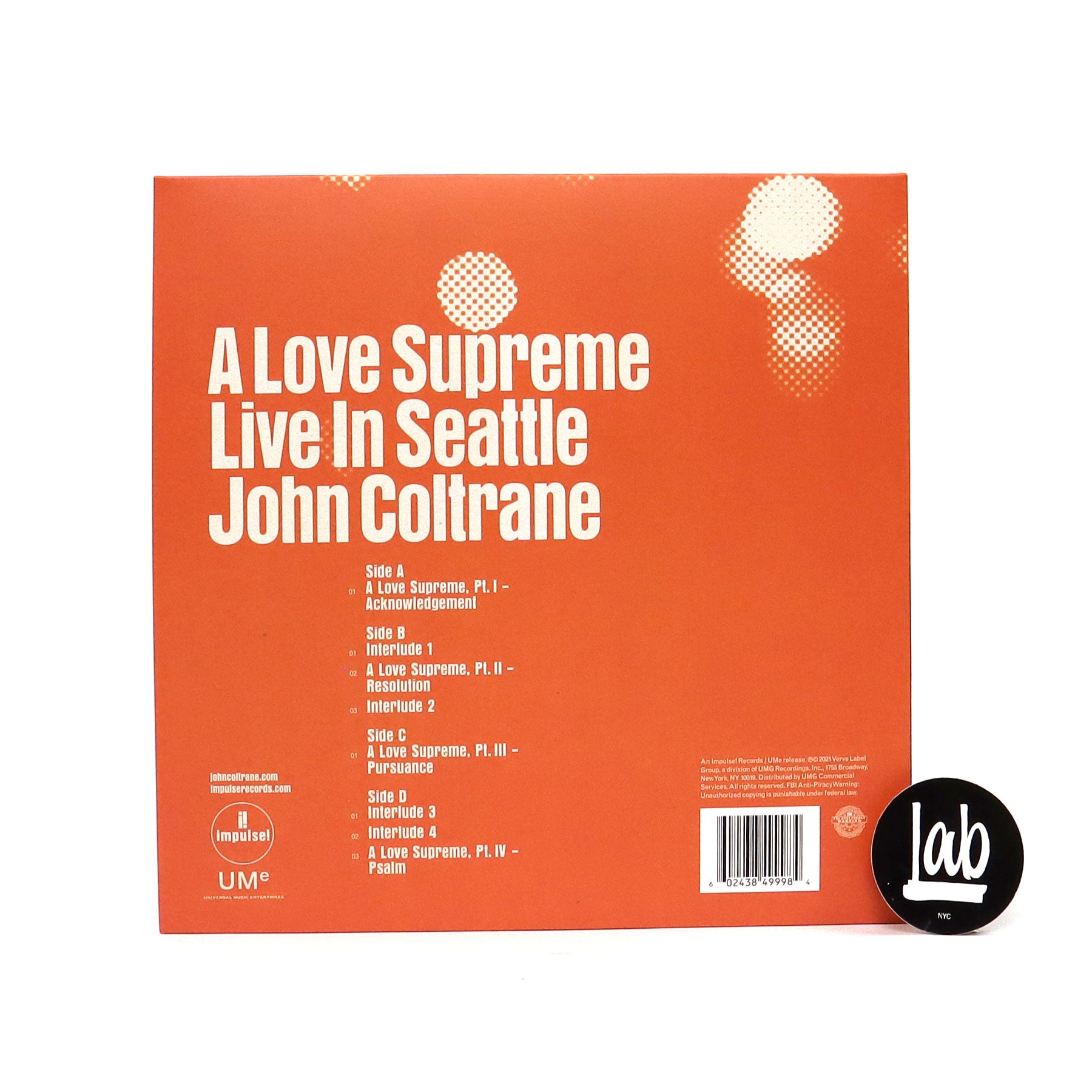 "Double vinyl LP pressing. This newly discovered live-recording of a performance of the Love Supreme suite is a revelation. Recorded at The Penthouse in Seattle on October 2, 1965, this recording transports the listener to a prime seat for piece of musical history. While not studio-quality audio, the power of the performance shines through. This version is also of the full suite and features an expanded band that includes the same Classic Quartet and Pharoah Sanders in his first official gig as part of Coltrane's group." - Impulse!