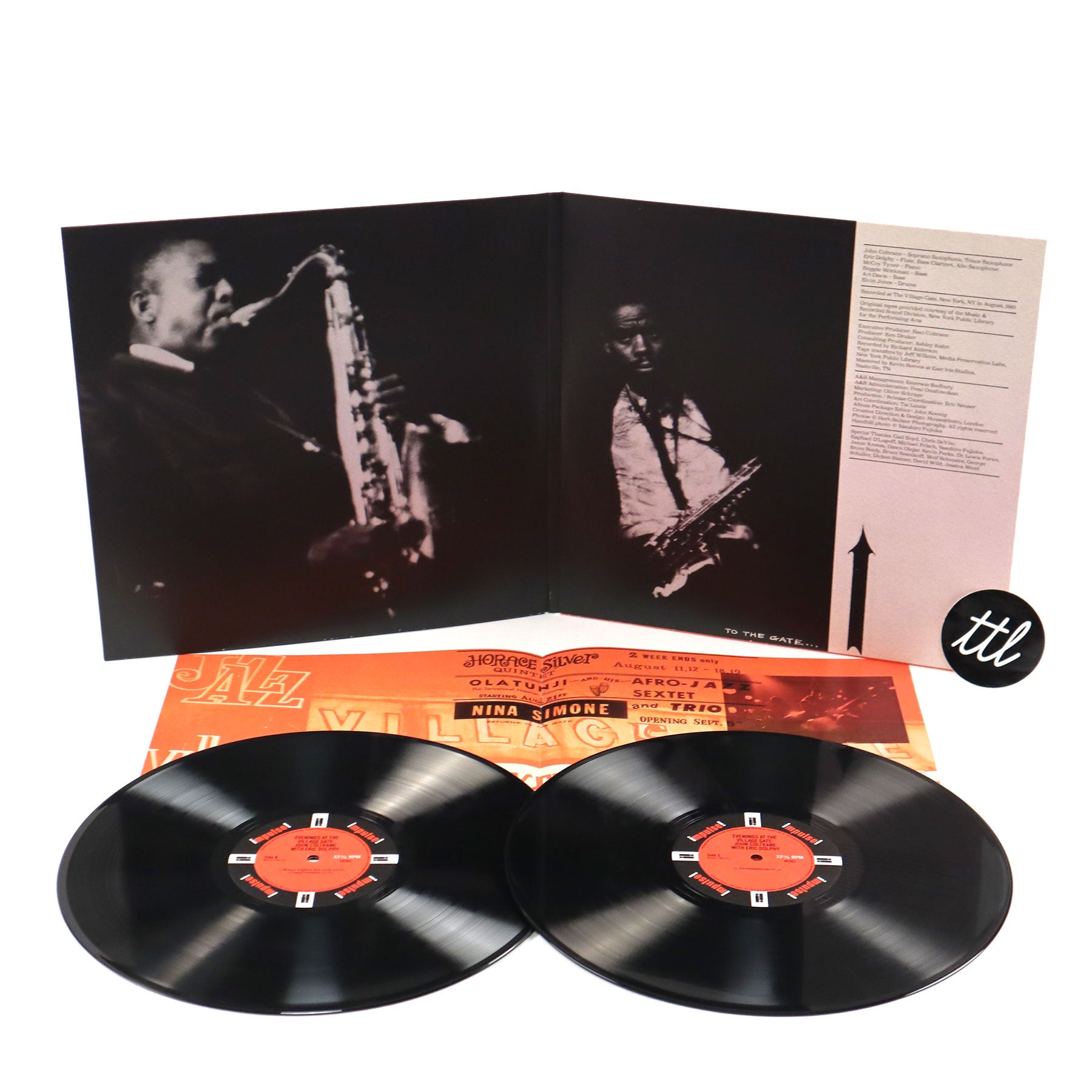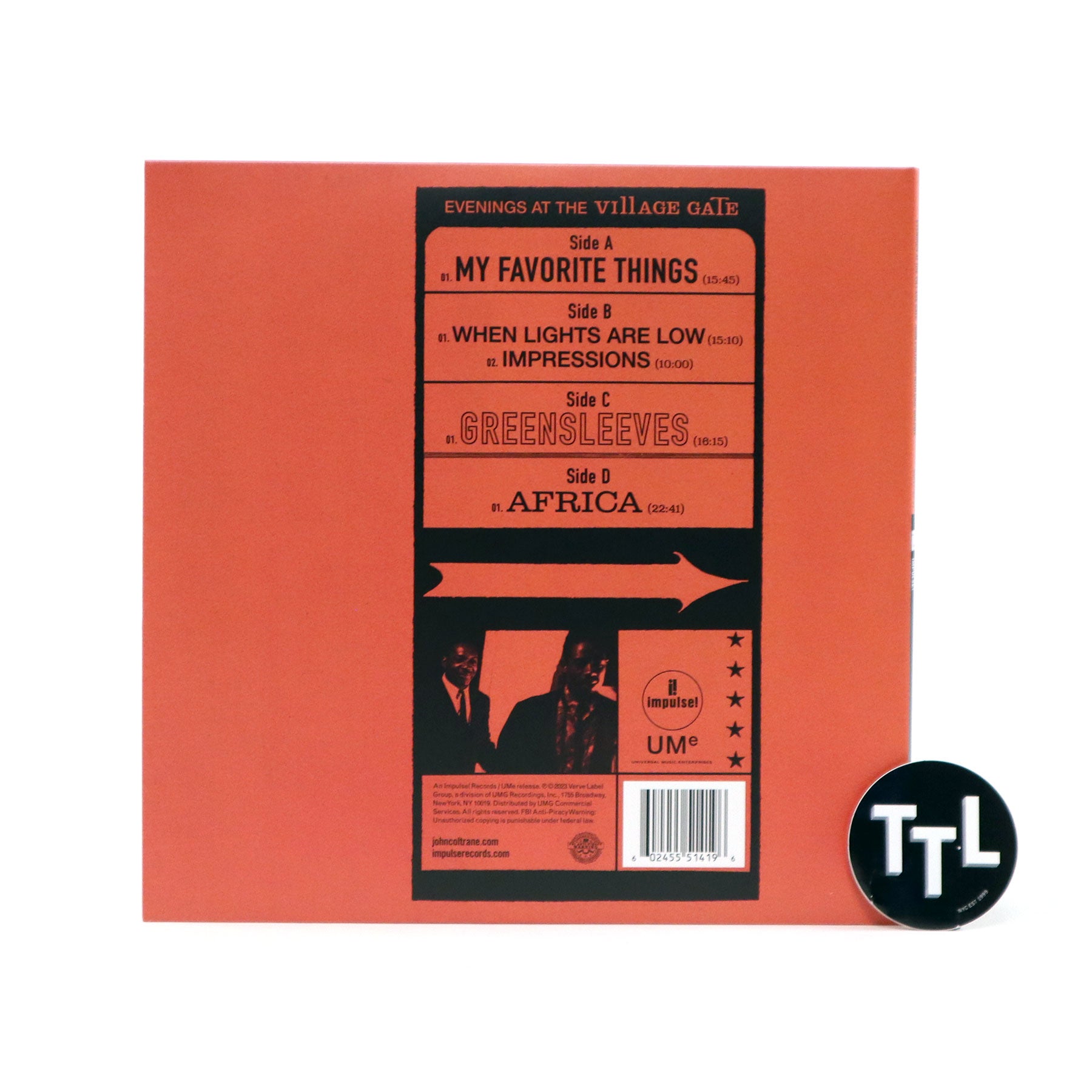 "In August of 1961, the John Coltrane Quintet played an engagement at the legendary Village Gate in Greenwich Village, New York. Eighty minutes of never-before-heard music from this group were recently discovered at the New York Public Library. In addition to some well-known Coltrane material ('Impressions'), there is a breathtaking feature for Eric Dolphy's bass clarinet on 'When Lights Are Low' and the only known non-studio recording of Coltrane's composition 'Africa', from the Africa/Brass album." - Impulse!