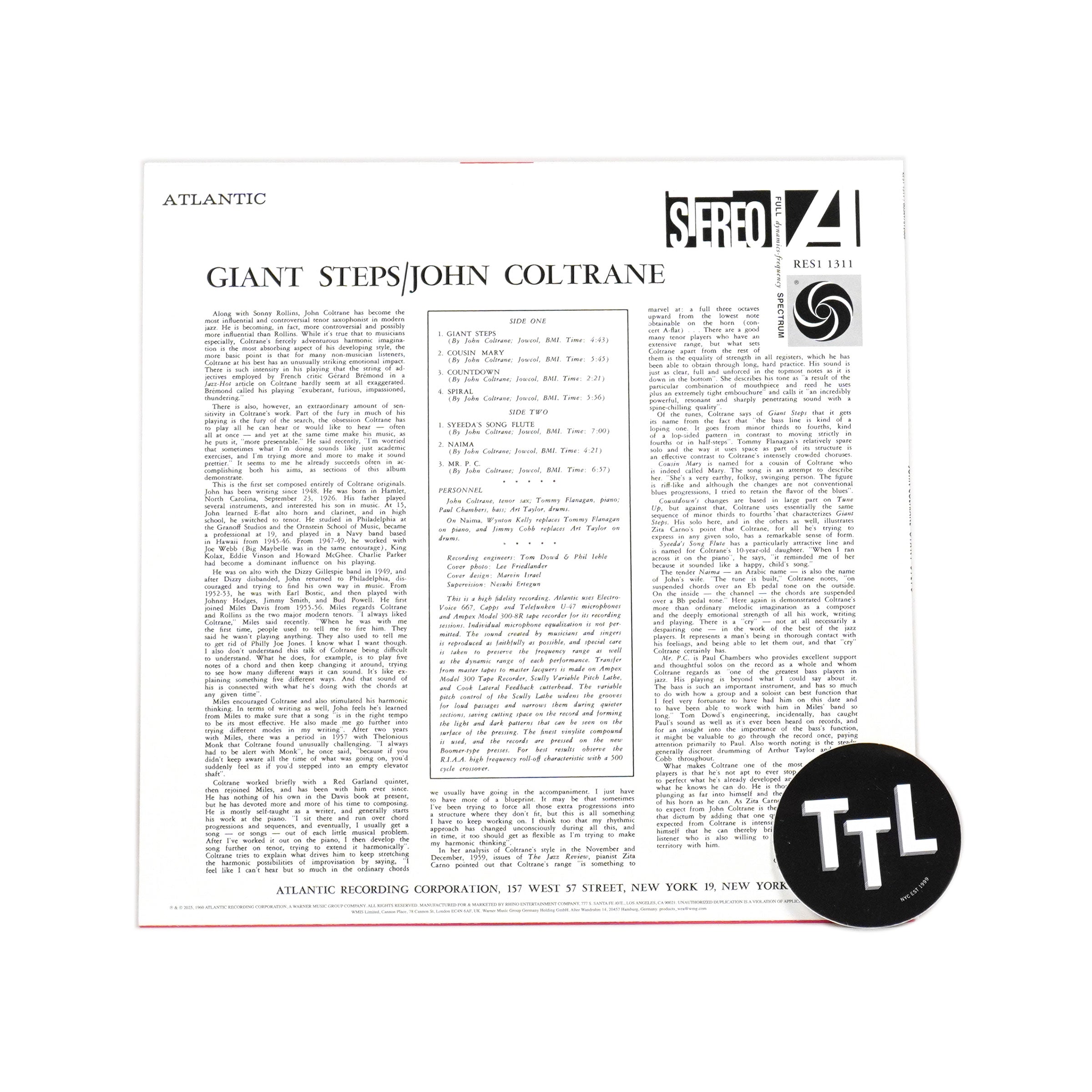 "A game-changer in jazz and an RIAA-certified Gold classic, Giant Steps marks John Coltrane’s legendary Atlantic Records debut, featuring some of his most iconic compositions——including the groundbreaking title track 'Giant Steps' and the soulful 'Naima.' Now pressed locally on 180-gram premium-quality vinyl at Fidelity Record Pressing's new plant in Oxnard, California, as part of Rhino’s exclusive Rhino Reserve line." - Atlantic