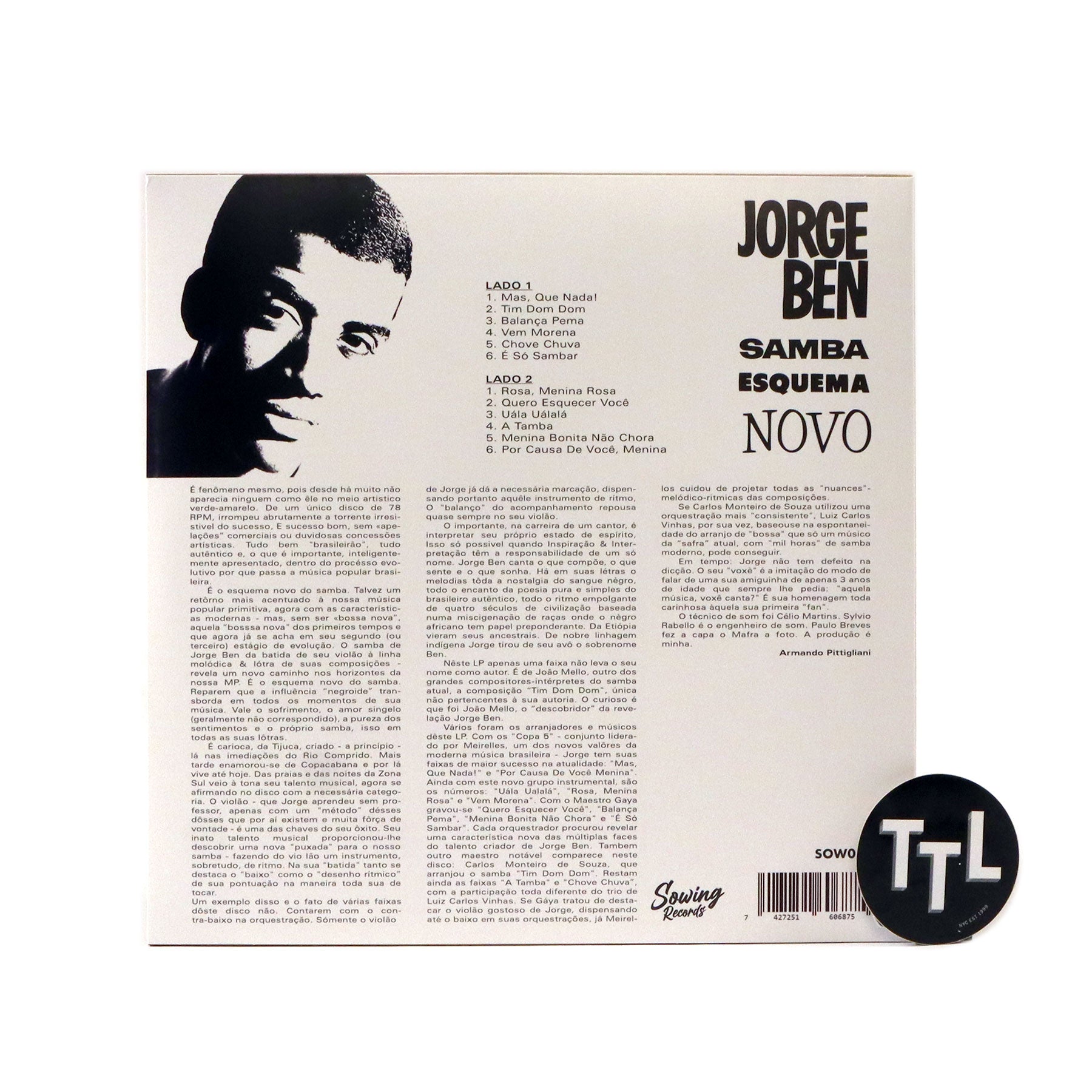 Debut studio album from Brazil's Jorge Ben. Samba Esquema Novo was originally released in 1963 and introduced the light yet propulsive rhythms which would give Jorge Ben a decades long career in Brazilian pop. The album is filled with whirling bossa nova rhythms and big band sounds, but is offset by Ben's guitar playing and signature vocal style. Coming out of the bossa nova movement that was spearheaded by Antônio Carlos Jobim and João Gilberto, Ben set himself apart with Samba Esquema Novo (literally New Style Samba). While it is not the pared down, percussion driven sound he would eventually develop, the album made a lasting impression throughout the world. Hits like "Mas que Nada" and "Chove Chuva" would go on to be covered by a wide array of artists. Twelve tracks in all.