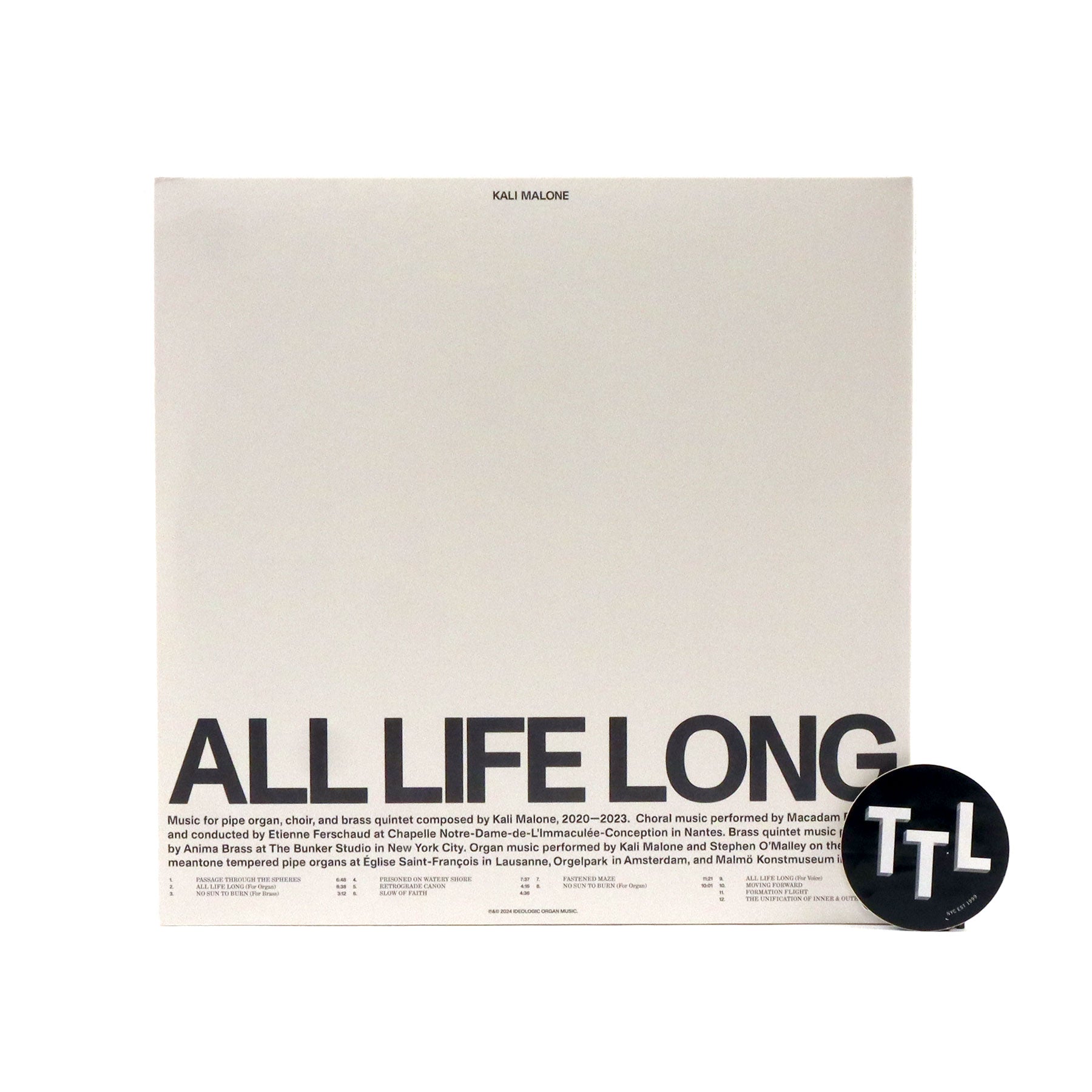 "Kali Malone’s new album 'All Life Long', created between 2020 - 2023, presents her first compositions for organ since 2019’s breakthrough album The Sacrificial Code alongside interrelated pieces for voice and brass performed by Macadam Ensemble and Anima Brass. Over the course of twelve pieces, harmonic themes and patterns recur, presented in altered forms and for varied instrumentation. They emerge and reemerge like echoes of their former selves, making the familiar uncanny. Propelled by lungs and breath rather than bellows and oscillators, Malone’s compositions for choir and brass take on expressive qualities that complicate the austerity that has defined her work, introducing lyricism and the beauty of human fallibility into music that has been driven by mechanical processes. At the same time, the works for organ, performed by Malone with additional accompaniment by Stephen O’Malley on four different organs dating from the 15th to 17th centuries, underscore the mighty, spectral power that those rigorous operations can achieve." - Ideologic Organ
