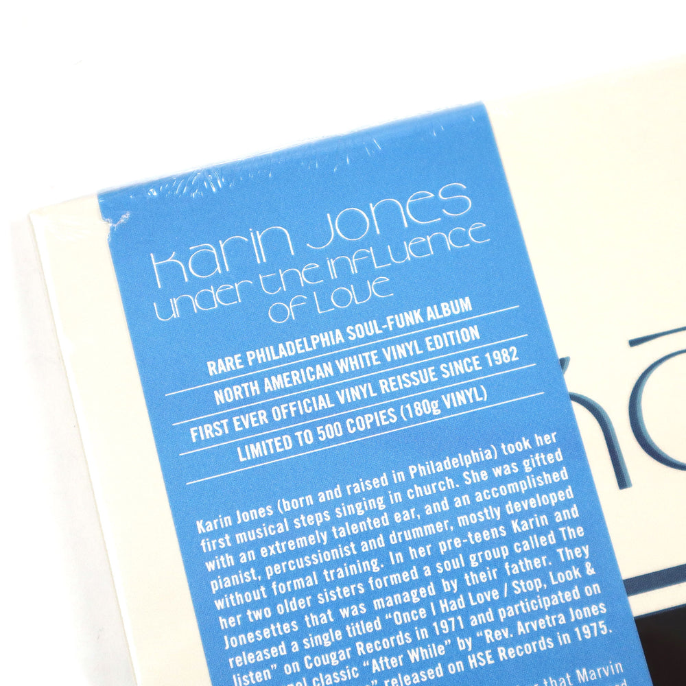 "Rare Philadelphia Soul-Funk album from 1982! Under The Influence Of Love is a monster of an album arranged by Dunn Pearson Jr (known for his work with Roy Ayers, Lou Ragland, Mary J. Blige, D’Angelo) and Bruce Hawes (Stevie Wonder, Kool And The Gang, The Temptations). All of this carefully supervised and produced by Jim Tyrrell. Also worth mentioning is that the duet on the album is the one and only time Eddie Levert, of the legendary O’Jays, sang with a female artist. Sadly (and shocking) Karin Jones suddenly passed away in 1984 from a diabetic coma. Strangely, she predicted an early demise while preparing her photo shoot for the album. Karin Jones was a true example of a bright light burning out way too quickly, thankfully we are left with the unique (and very rare) document that is her Under The Influence Of Love album. The entire album is filled with heart breaking modern soul, deep disco, boogie-funk and a great range of tempos…all of this is topped off with Karin’s trademark vocals. Also included is the hit ‘Ready, Ready Love’ which was one of the biggest songs of the London steppers scene (or more fashionably known as ‘rare groove’) and almost impossible to get a hold of (unless you had deep pockets). To this day it remains a much sought-after gem and a ‘holy grail’ for fans and collectors alike. Tidal Waves Music now proudly presents the FIRST ever OFFICIAL vinyl reissue of this rare Philadelphia album that goes for hefty amounts on the second-hand market (it was originally released on Handshake Records And Tapes back in 1982 and plagued by inferior bootlegs ever since). This unique record comes as a deluxe 180g WHITE North American vinyl edition (strictly limited to 500 copies) with obi strip and features the original artwork." - Tidal Waves Music