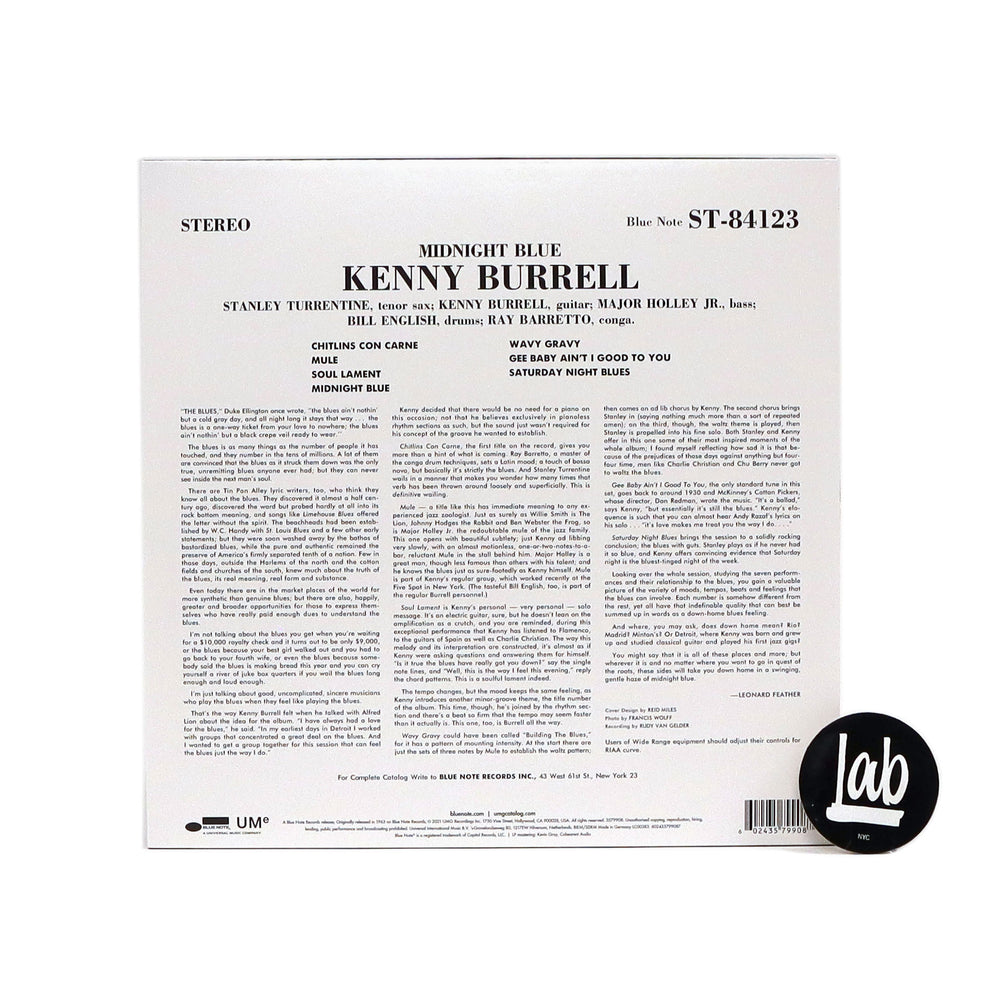 "Guitarist Kenny Burrell debuted on Blue Note Records in 1956 and over the following 7 years made a series of excellent albums for the label that culminated with his masterwork Midnight Blue. Recorded in 1963, the album waded deep into the blues, conjuring an alluring late-night vibe with a profoundly soulful cast including tenor saxophonist Stanley Turrentine, bassist Major Holley, Jr., drummer Bill English, and Ray Barretto on congas. Burrell originals including 'Chitlins con Carne,' 'Midnight Blue,' 'Saturday Night Blues,' and the stunning solo guitar piece 'Soul Lament' set the tone for this timeless classic adorned by one of the all-time great Reid Miles cover designs. This Blue Note Classic Vinyl Edition is all-analog, mastered by Kevin Gray from the original master tapes, and pressed on 180g vinyl at Optimal." - Blue Note Records