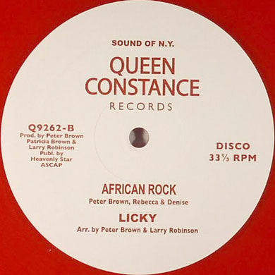 Stupid rare Queen Constance cuts back to back on one 12". There's a few hundred dollars worth of rare disco goodness contained on this slab of pretty red wax (just sayin') both with some of the funkiest P&P production to come out of Harlem. Check the floor filling rhythms and wild moog synth work (courtesy of Patrick Adams) on Kim Taylor's "Stump Your Feet And Dance," then get down to the wicked afro-disco vibes of Licky's "African Rock." Serious disco grooves right here pressed on cherry red vinyl. Recommended.