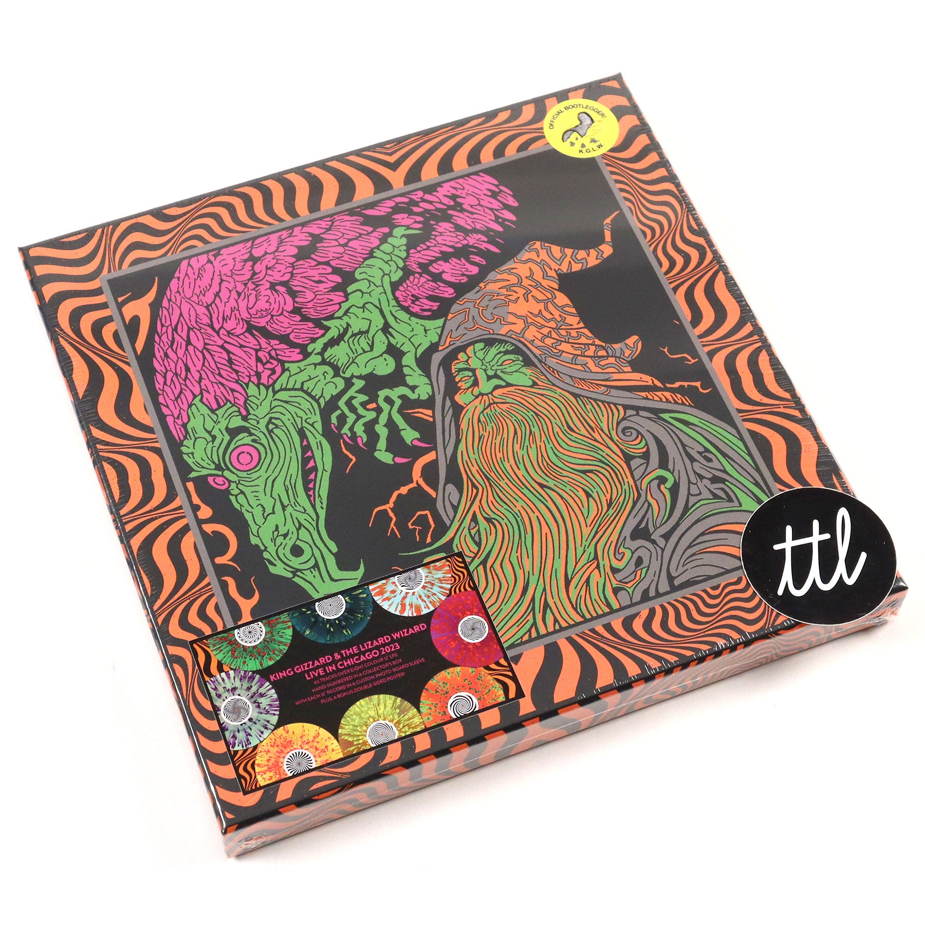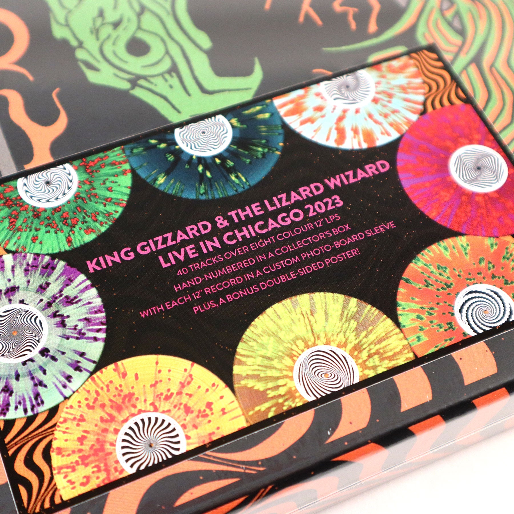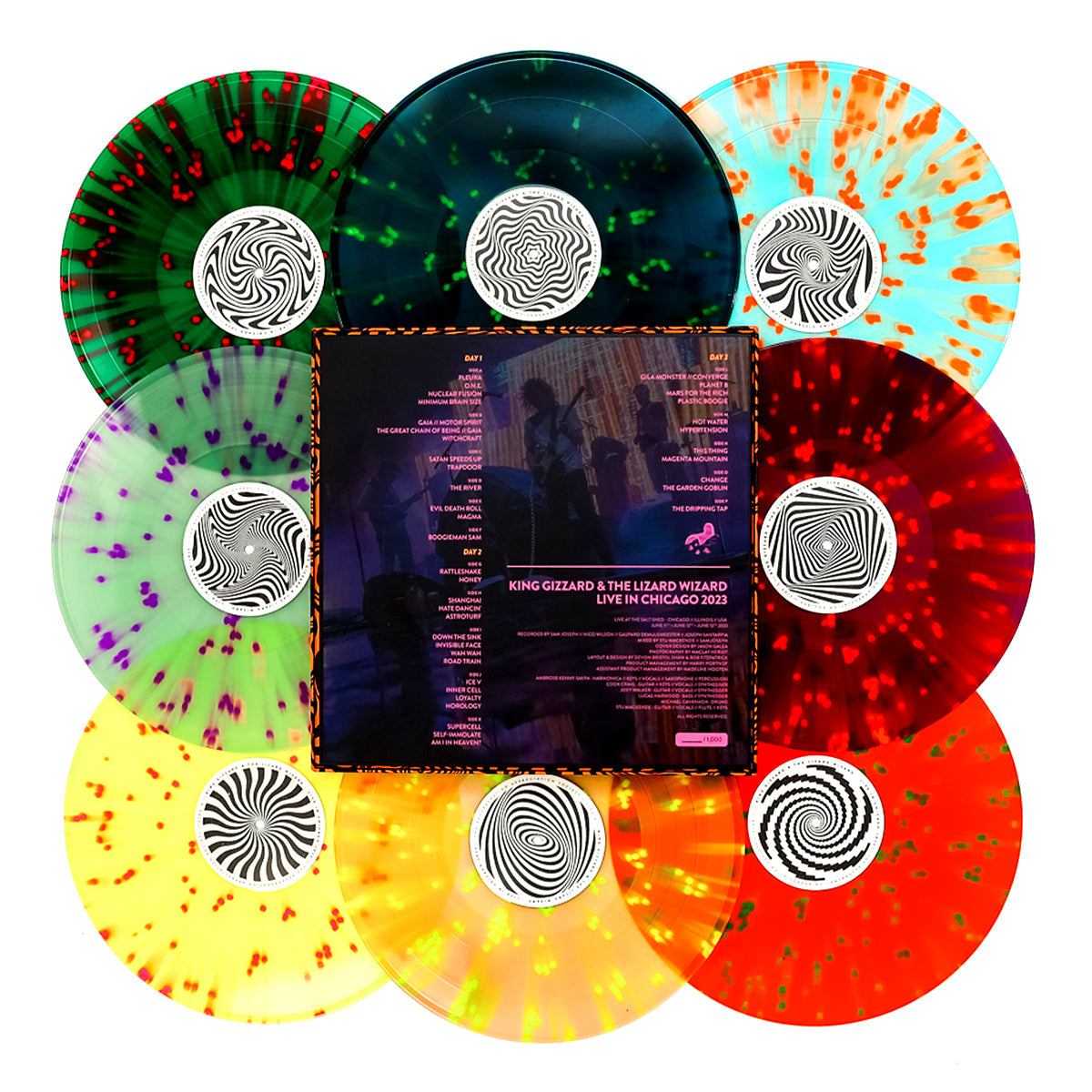 "King Gizzard - Live in Chicago 2023! 40 tracks pressed on 8 vinyl records, chronicling their epic 2023 show at The Salt Shed, mixed by the man himself, Stu Mackenzie. Limited to the first 1000 Splatter Vinyl Box Sets, a custom numbered collectors box + infographic hype sticker. Each 12" a unique splatter color vinyl, in a custom photo board inner-sleeve + a unique hypnotic op art inner label. Plus a bonus double-sided poster, all housed in a custom box." - The Reverberation Appreciation Society